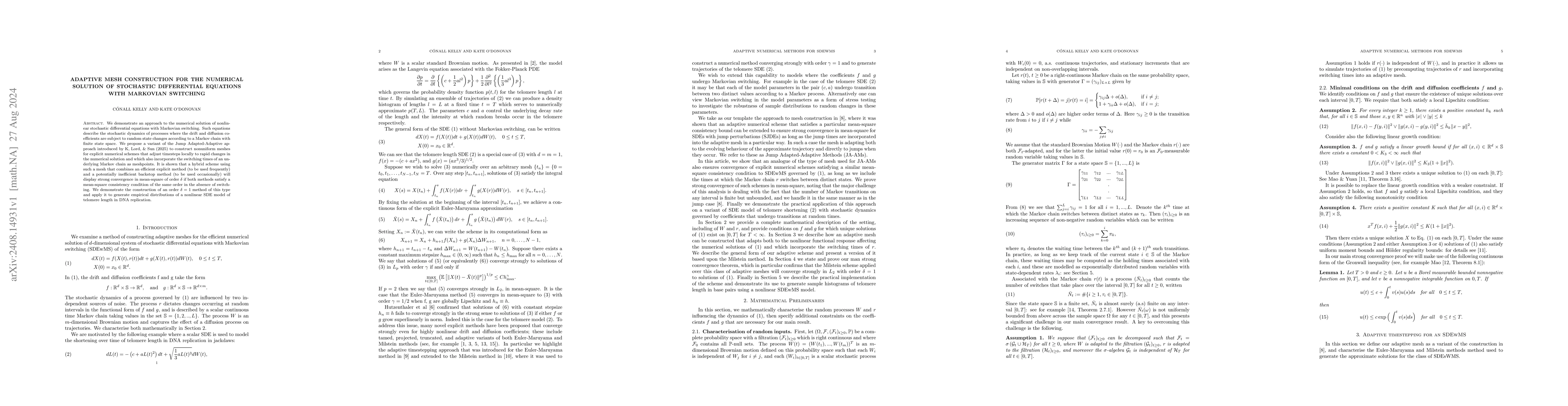 This paper proposes a new adaptive mesh construction method for numerically solving stochastic differential equations with Markovian switching, which adjusts timesteps to rapid changes and incorporates Markov switching times as meshpoints. The hybrid scheme combining efficient and backstop methods demonstrates strong mean-square convergence, exemplified by a first-order method applied to a telomere length model.