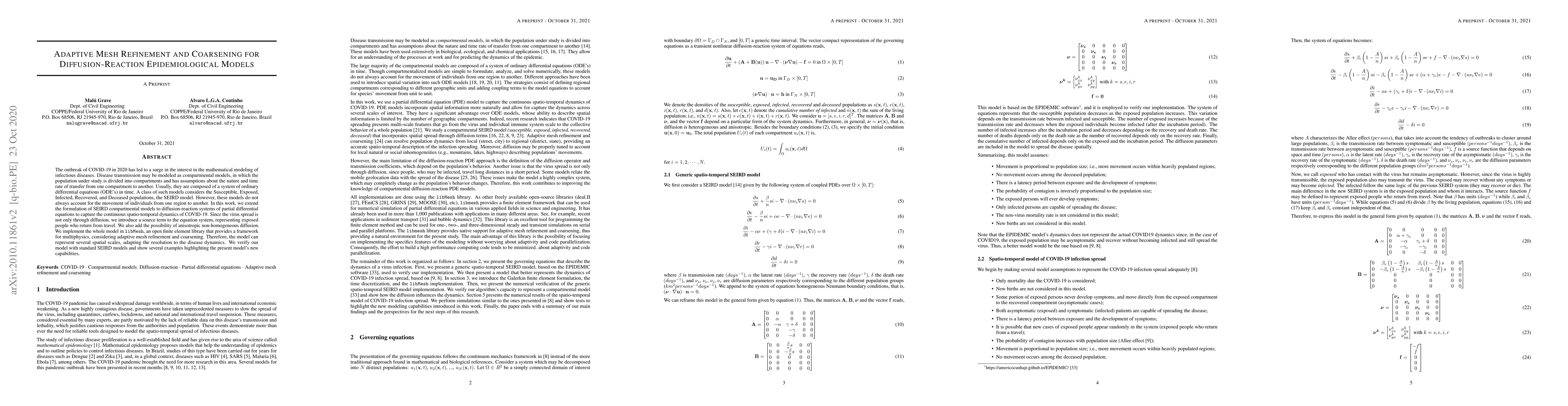 The outbreak of COVID-19 in 2020 has led to a surge in the interest in the mathematical modeling of infectious diseases. Disease transmission may be modeled as compartmental models, in which the population under study is divided into compartments and has assumptions about the nature and time rate of transfer from one compartment to another. Usually, they are composed of a system of ordinary differential equations (ODE's) in time. A class of such models considers the Susceptible, Exposed, Infected, Recovered, and Deceased populations, the SEIRD model. However, these models do not always account for the movement of individuals from one region to another. In this work, we extend the formulation of SEIRD compartmental models to diffusion-reaction systems of partial differential equations to capture the continuous spatio-temporal dynamics of COVID-19. Since the virus spread is not only through diffusion, we introduce a source term to the equation system, representing exposed people who return from travel. We also add the possibility of anisotropic non-homogeneous diffusion. We implement the whole model in \texttt{libMesh}, an open finite element library that provides a framework for multiphysics, considering adaptive mesh refinement and coarsening. Therefore, the model can represent several spatial scales, adapting the resolution to the disease dynamics. We verify our model with standard SEIRD models and show several examples highlighting the present model's new capabilities.