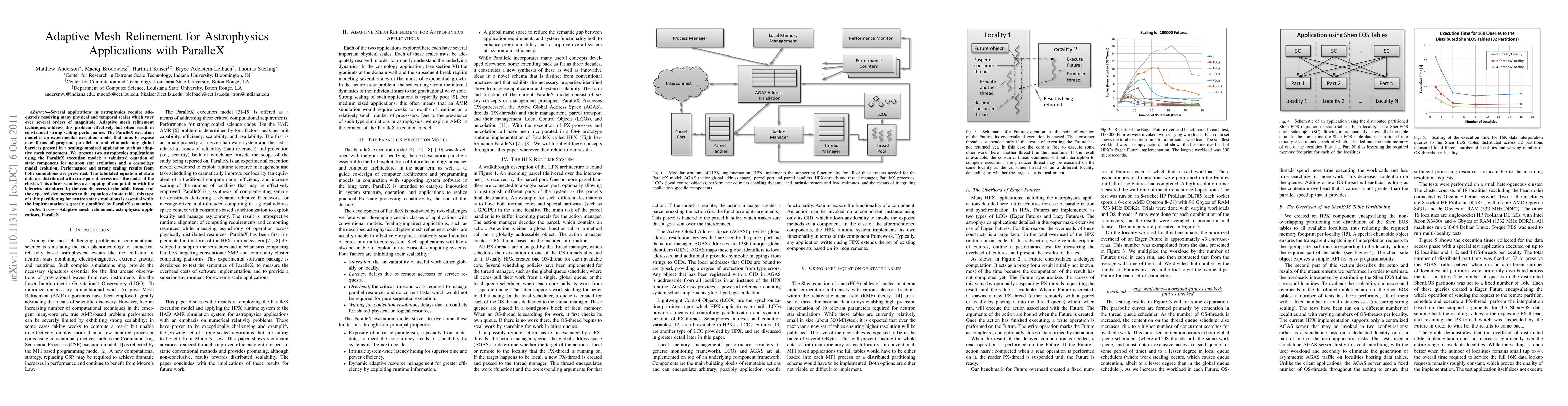 Several applications in astrophysics require adequately resolving many physical and temporal scales which vary over several orders of magnitude. Adaptive mesh refinement techniques address this problem effectively but often result in constrained strong scaling performance. The ParalleX execution model is an experimental execution model that aims to expose new forms of program parallelism and eliminate any global barriers present in a scaling-impaired application such as adaptive mesh refinement. We present two astrophysics applications using the ParalleX execution model: a tabulated equation of state component for neutron star evolutions and a cosmology model evolution. Performance and strong scaling results from both simulations are presented. The tabulated equation of state data are distributed with transparent access over the nodes of the cluster. This allows seamless overlapping of computation with the latencies introduced by the remote access to the table. Because of the expected size increases to the equation of state table, this type of table partitioning for neutron star simulations is essential while the implementation is greatly simplified by ParalleX semantics.
