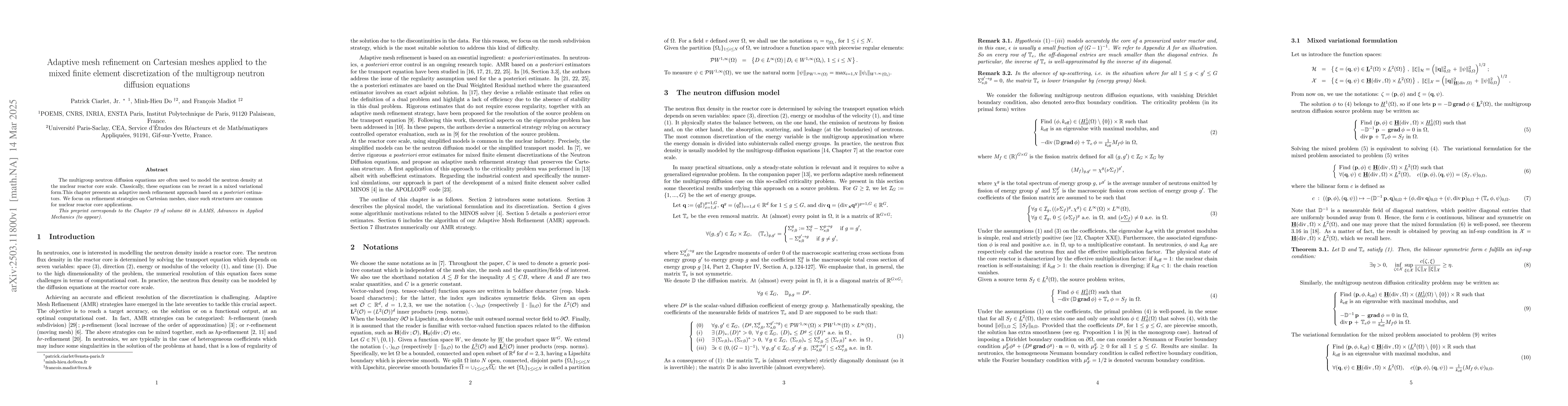 The paper presents a novel AMR strategy for mixed finite element discretization of multigroup neutron diffusion equations, incorporating reliable and locally efficient a posteriori error estimators with a Cartesian mesh preservation refinement strategy.