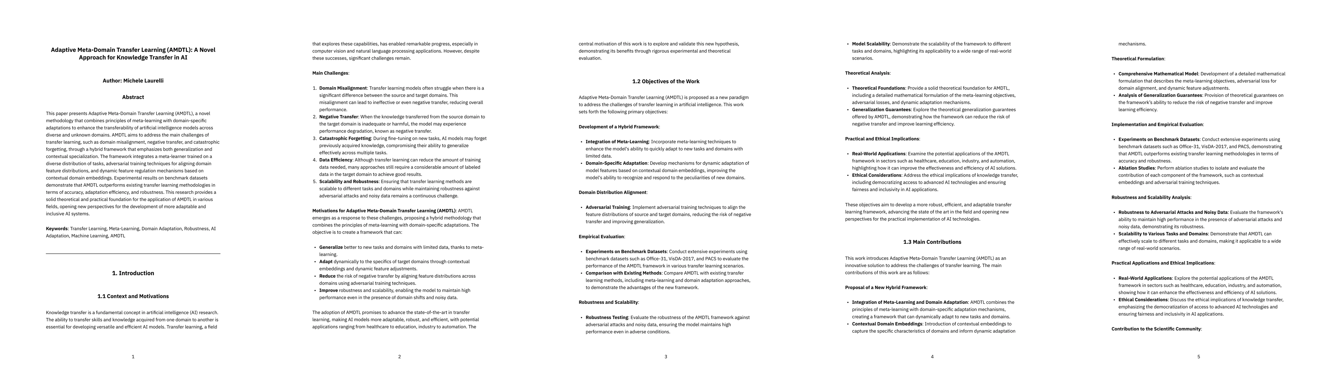 This paper introduces Adaptive Meta-Domain Transfer Learning (AMDTL), a novel method that leverages meta-learning and domain-specific adaptations to improve AI model transfer across different domains. AMDTL addresses challenges like domain misalignment and negative transfer, achieving better accuracy and robustness compared to existing methods.