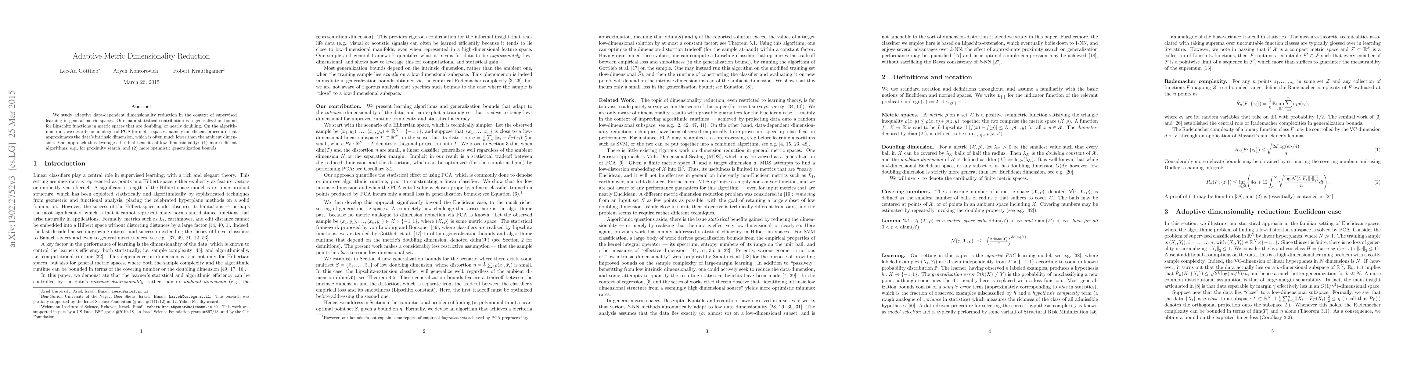 We study adaptive data-dependent dimensionality reduction in the context of supervised learning in general metric spaces. Our main statistical contribution is a generalization bound for Lipschitz functions in metric spaces that are doubling, or nearly doubling. On the algorithmic front, we describe an analogue of PCA for metric spaces: namely an efficient procedure that approximates the data's intrinsic dimension, which is often much lower than the ambient dimension. Our approach thus leverages the dual benefits of low dimensionality: (1) more efficient algorithms, e.g., for proximity search, and (2) more optimistic generalization bounds.