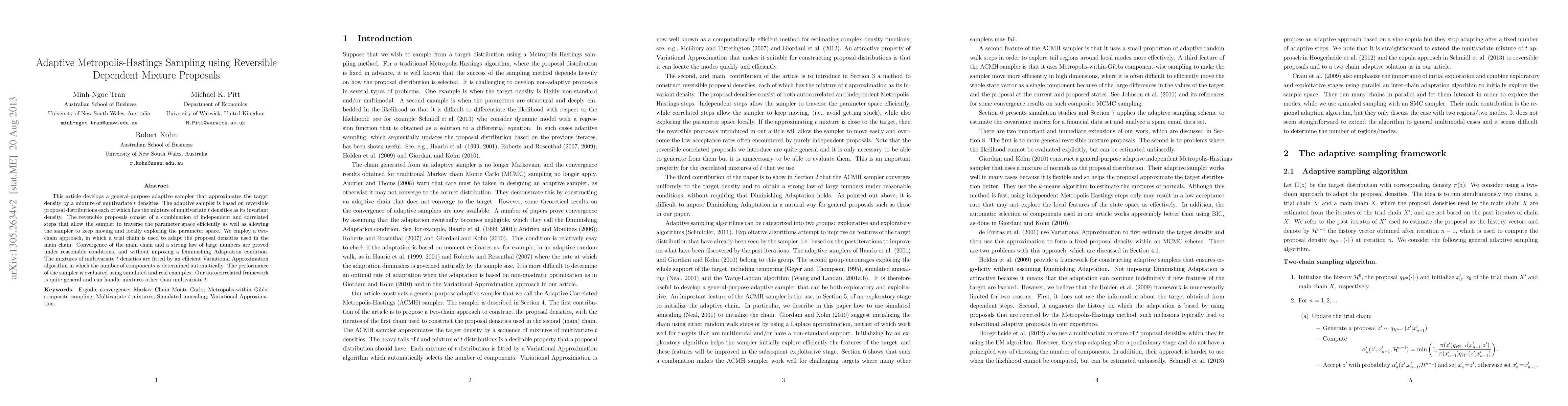 This article develops a general-purpose adaptive sampler that approximates the target density by a mixture of multivariate t densities. The adaptive sampler is based on reversible proposal distributions each of which has the mixture of multivariate t densities as its invariant density. The reversible proposals consist of a combination of independent and correlated steps that allow the sampler to traverse the parameter space efficiently as well as allowing the sampler to keep moving and locally exploring the parameter space. We employ a two-chain approach, in which a trial chain is used to adapt the proposal densities used in the main chain. Convergence of the main chain and a strong law of large numbers are proved under reasonable conditions, and without imposing a Diminishing Adaptation condition. The mixtures of multivariate t densities are fitted by an efficient Variational Approximation algorithm in which the number of components is determined automatically. The performance of the sampler is evaluated using simulated and real examples. Our autocorrelated framework is quite general and can handle mixtures other than multivariate t.