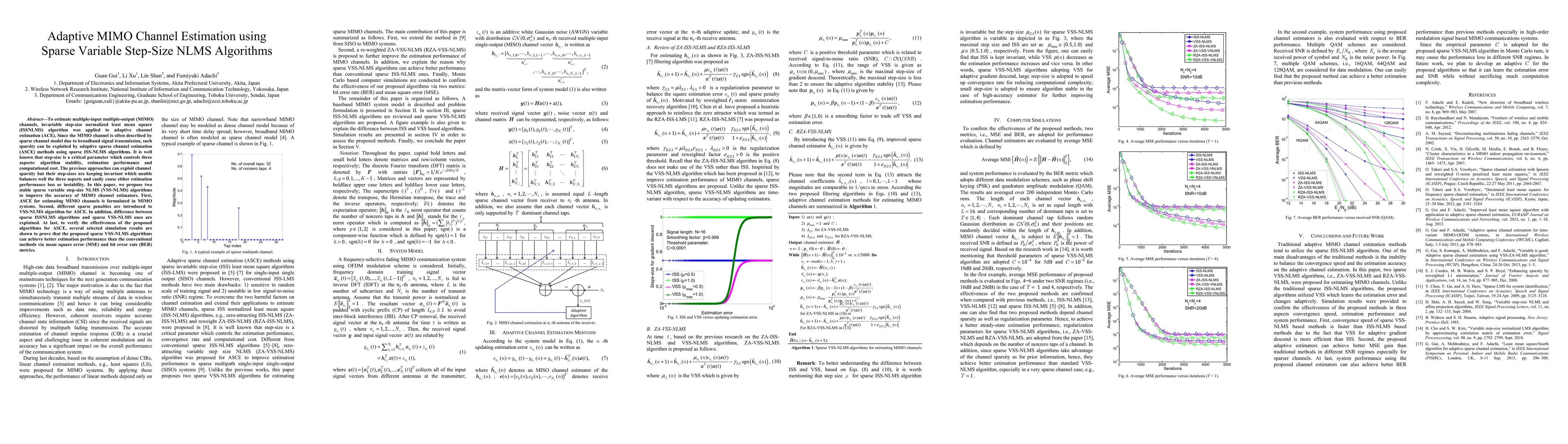 This paper proposes two stable sparse variable step-size NLMS (VSS-NLMS) algorithms to enhance the accuracy of adaptive multiple-input multiple-output (MIMO) channel estimation. It introduces different sparse penalties and compares with conventional invariant step-size methods, demonstrating superior performance in terms of mean square error and bit error rate through simulations.