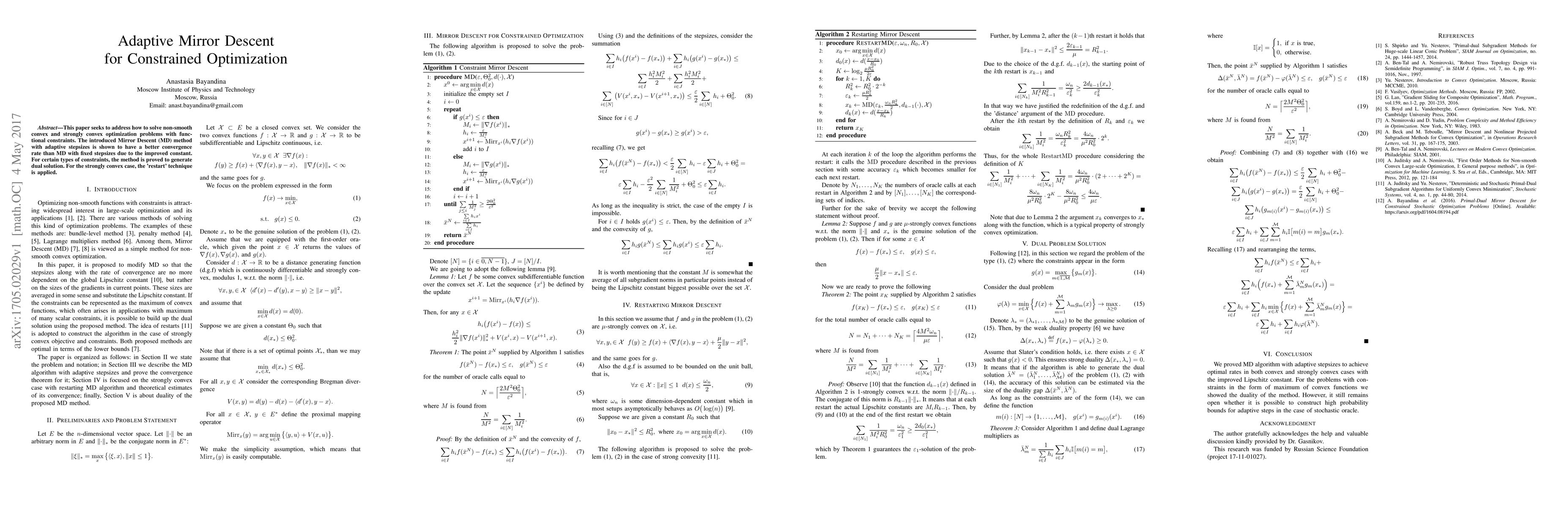This paper proposes an adaptive Mirror Descent method for solving non-smooth convex optimization problems with functional constraints, demonstrating improved convergence rates and dual solution generation, with a restart technique for strongly convex cases.