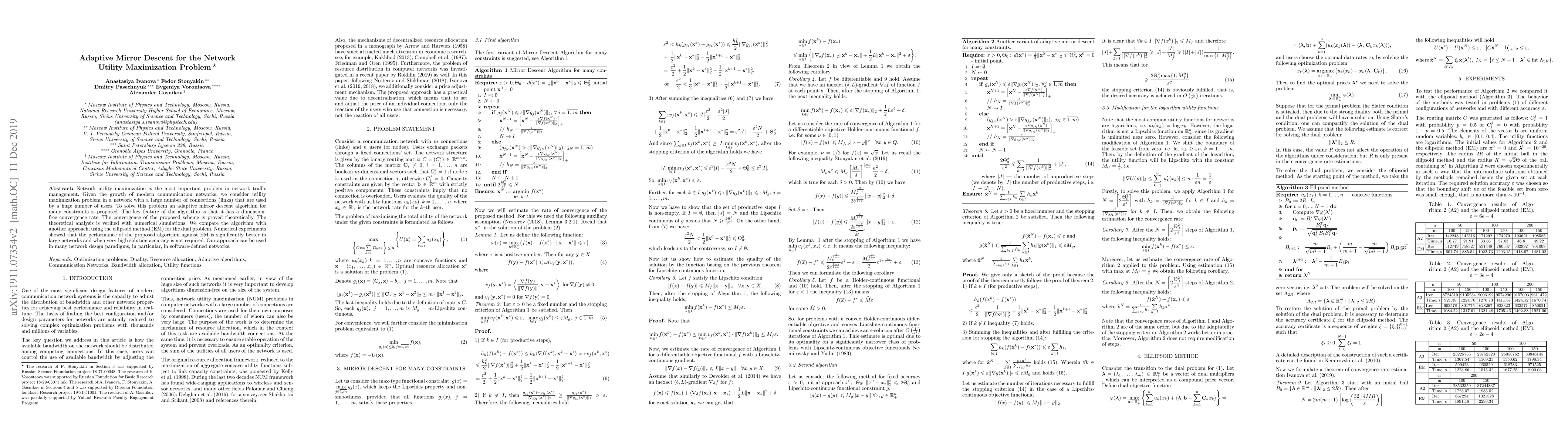 This paper proposes an adaptive mirror descent algorithm for network utility maximization in large networks, demonstrating a dimension-free convergence rate. The algorithm outperforms the ellipsoid method in large-scale networks, especially when high solution accuracy is not critical, and is applicable to software-defined networks.