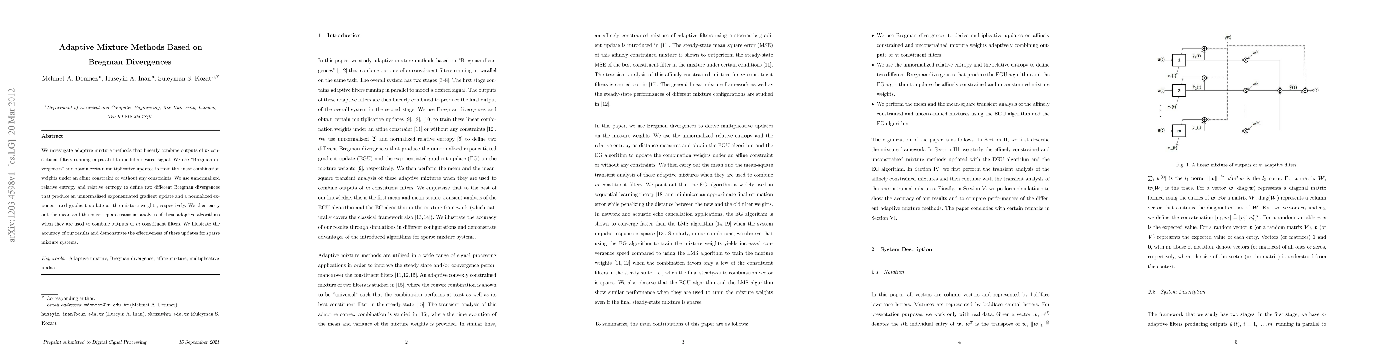 We investigate adaptive mixture methods that linearly combine outputs of $m$ constituent filters running in parallel to model a desired signal. We use "Bregman divergences" and obtain certain multiplicative updates to train the linear combination weights under an affine constraint or without any constraints. We use unnormalized relative entropy and relative entropy to define two different Bregman divergences that produce an unnormalized exponentiated gradient update and a normalized exponentiated gradient update on the mixture weights, respectively. We then carry out the mean and the mean-square transient analysis of these adaptive algorithms when they are used to combine outputs of $m$ constituent filters. We illustrate the accuracy of our results and demonstrate the effectiveness of these updates for sparse mixture systems.