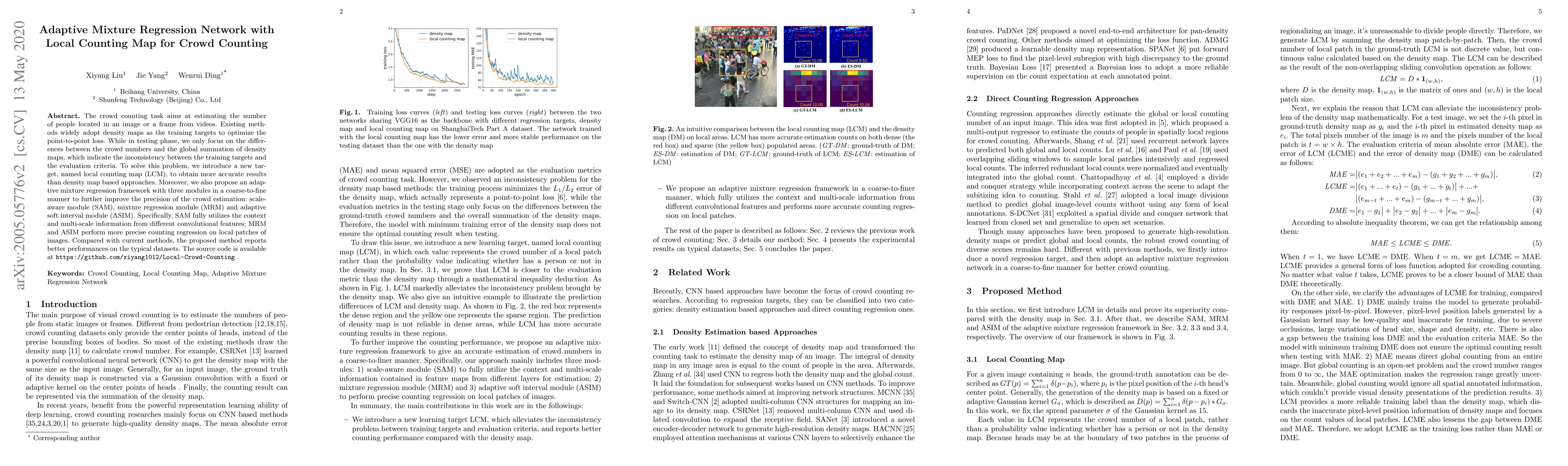 This paper proposes an adaptive mixture regression network with a local counting map to improve crowd counting accuracy, addressing the inconsistency between training targets and evaluation criteria. The method includes a scale-aware module, mixture regression module, and adaptive soft interval module for precise counting. The results show better performance on standard datasets compared to existing methods.