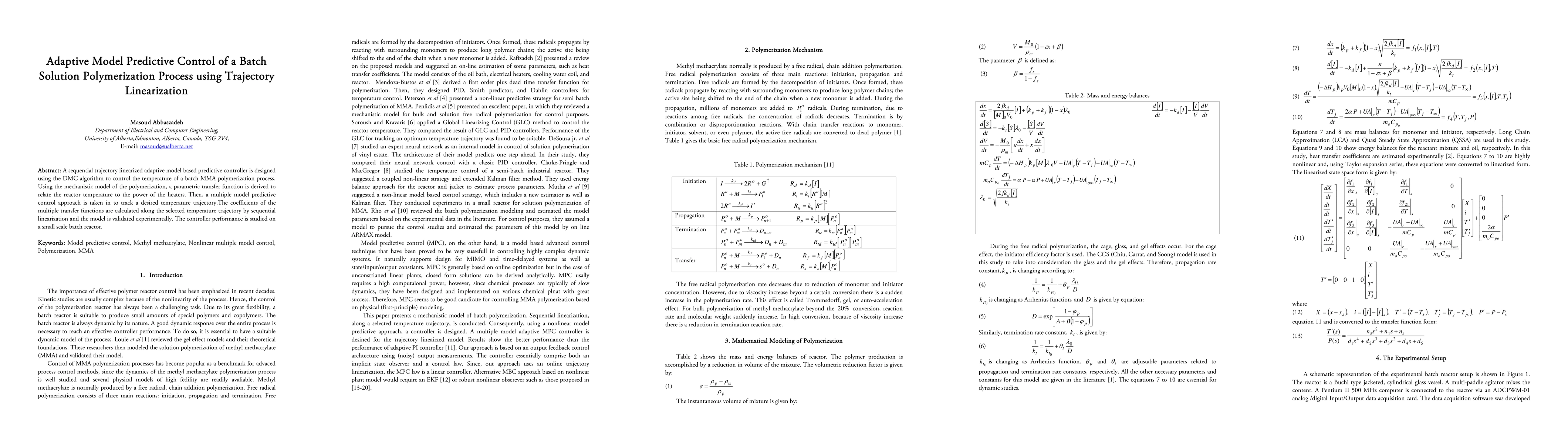 A new control system for a batch polymerization process was developed using adaptive model predictive control, showing promise in temperature trajectory tracking. The method involves sequential linearization and experimental validation on a small-scale reactor.