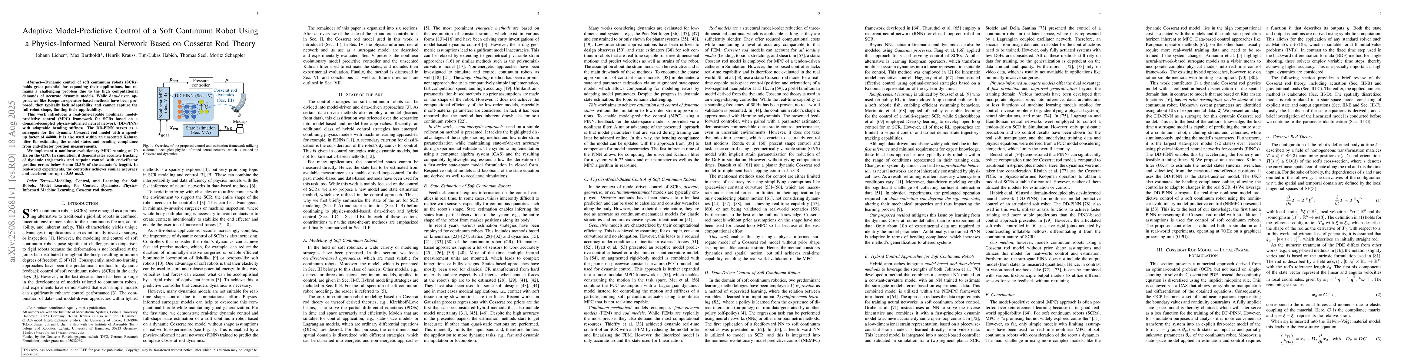 Dynamic control of soft continuum robots (SCRs) holds great potential for expanding their applications, but remains a challenging problem due to the high computational demands of accurate dynamic models. While data-driven approaches like Koopman-operator-based methods have been proposed, they typically lack adaptability and cannot capture the full robot shape, limiting their applicability. This work introduces a real-time-capable nonlinear model-predictive control (MPC) framework for SCRs based on a domain-decoupled physics-informed neural network (DD-PINN) with adaptable bending stiffness. The DD-PINN serves as a surrogate for the dynamic Cosserat rod model with a speed-up factor of 44000. It is also used within an unscented Kalman filter for estimating the model states and bending compliance from end-effector position measurements. We implement a nonlinear evolutionary MPC running at 70 Hz on the GPU. In simulation, it demonstrates accurate tracking of dynamic trajectories and setpoint control with end-effector position errors below 3 mm (2.3% of the actuator's length). In real-world experiments, the controller achieves similar accuracy and accelerations up to 3.55 m/s2.