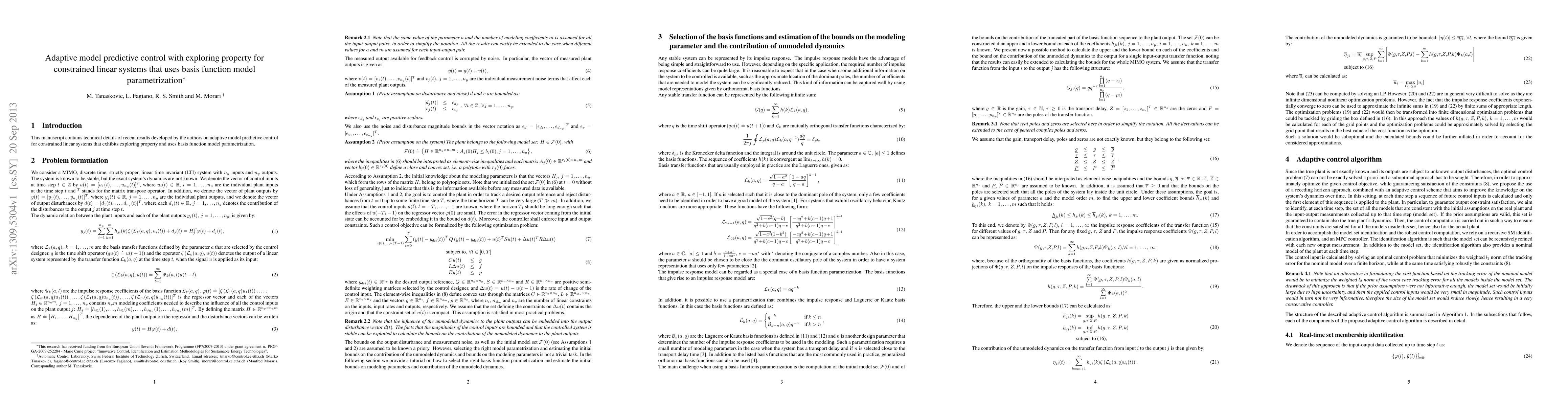Summary: This paper presents an adaptive model predictive control method for constrained linear systems, incorporating an exploring property and utilizing basis function model parametrization to enhance system performance. The approach aims to improve control efficiency while maintaining constraints.