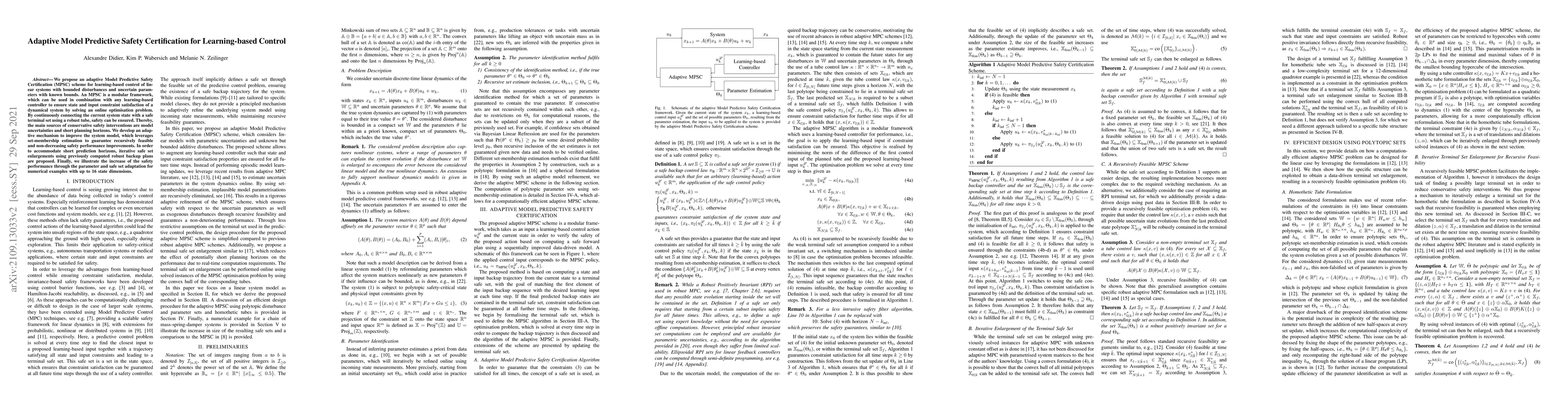 This paper proposes an adaptive Model Predictive Safety Certification (MPSC) scheme for learning-based control of linear systems, ensuring state and input constraints through online optimization. The adaptive mechanism enhances the system model and utilizes robust tube methods to improve safety performance while addressing model uncertainties and short planning horizons.