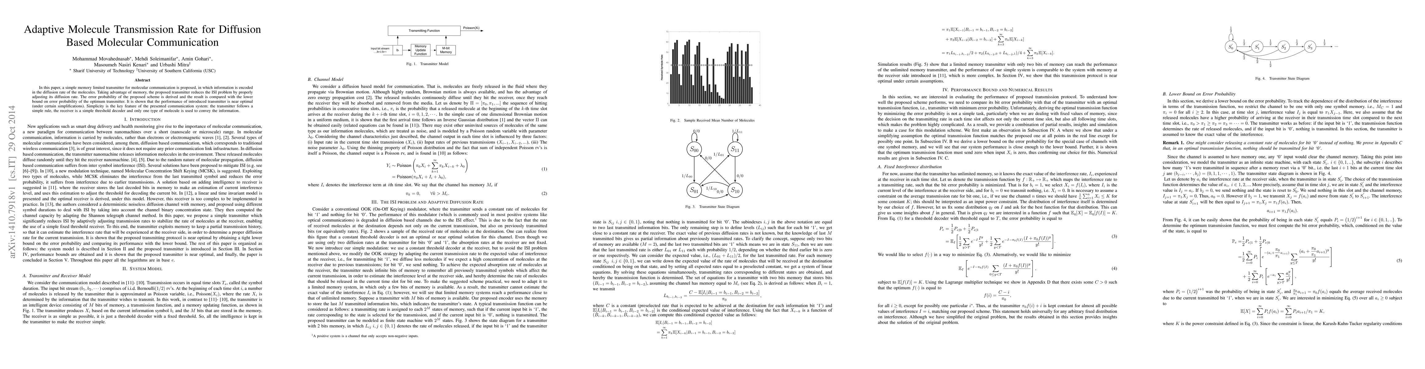 In this paper, a simple memory limited transmitter for molecular communication is proposed, in which information is encoded in the diffusion rate of the molecules. Taking advantage of memory, the proposed transmitter reduces the ISI problem by properly adjusting its diffusion rate. The error probability of the proposed scheme is derived and the result is compared with the lower bound on error probability of the optimum transmitter. It is shown that the performance of introduced transmitter is near optimal (under certain simplifications). Simplicity is the key feature of the presented communication system: the transmitter follows a simple rule, the receiver is a simple threshold decoder and only one type of molecule is used to convey the information.