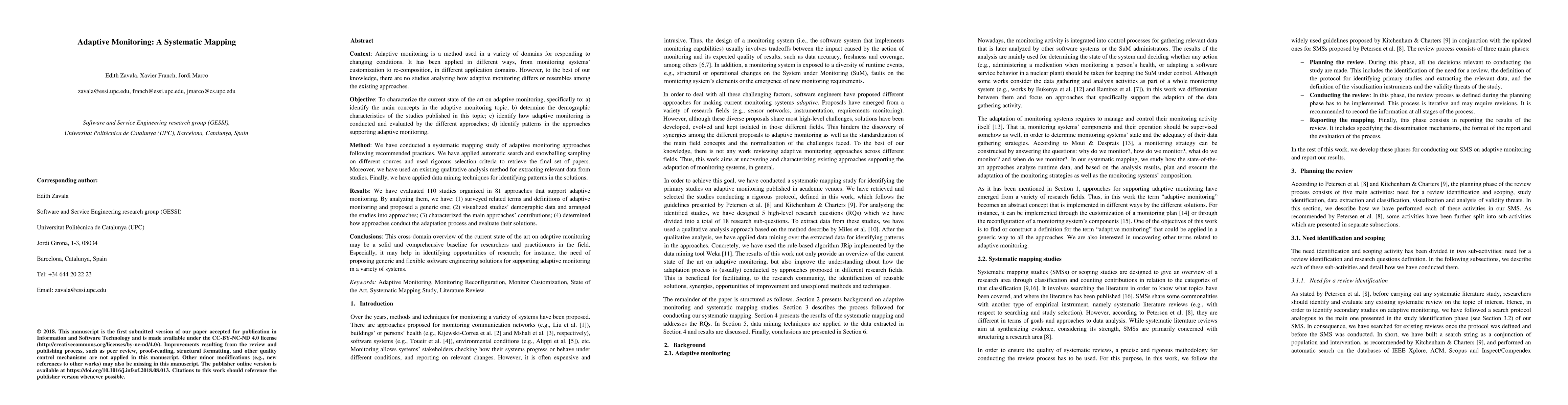 Context: Adaptive monitoring is a method used in a variety of domains for responding to changing conditions. It has been applied in different ways, from monitoring systems' customization to re-composition, in different application domains. However, to the best of our knowledge, there are no studies analyzing how adaptive monitoring differs or resembles among the existing approaches. Method: We have conducted a systematic mapping study of adaptive monitoring approaches following recommended practices. We have applied automatic search and snowballing sampling on different sources and used rigorous selection criteria to retrieve the final set of papers. Moreover, we have used an existing qualitative analysis method for extracting relevant data from studies. Finally, we have applied data mining techniques for identifying patterns in the solutions. Conclusions: This cross-domain overview of the current state of the art on adaptive monitoring may be a solid and comprehensive baseline for researchers and practitioners in the field. Especially, it may help in identifying opportunities of research, for instance, the need of proposing generic and flexible software engineering solutions for supporting adaptive monitoring in a variety of systems.