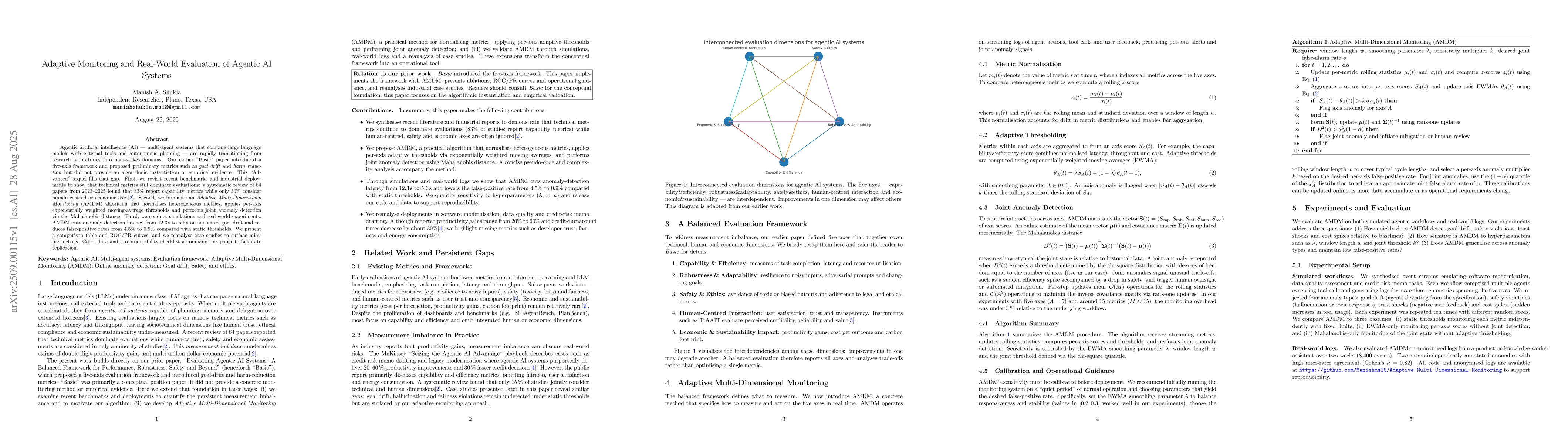 Agentic artificial intelligence (AI) -- multi-agent systems that combine large language models with external tools and autonomous planning -- are rapidly transitioning from research laboratories into high-stakes domains. Our earlier "Basic" paper introduced a five-axis framework and proposed preliminary metrics such as goal drift and harm reduction but did not provide an algorithmic instantiation or empirical evidence. This "Advanced" sequel fills that gap. First, we revisit recent benchmarks and industrial deployments to show that technical metrics still dominate evaluations: a systematic review of 84 papers from 2023--2025 found that 83% report capability metrics while only 30% consider human-centred or economic axes [2]. Second, we formalise an Adaptive Multi-Dimensional Monitoring (AMDM) algorithm that normalises heterogeneous metrics, applies per-axis exponentially weighted moving-average thresholds and performs joint anomaly detection via the Mahalanobis distance. Third, we conduct simulations and real-world experiments. AMDM cuts anomaly-detection latency from 12.3 s to 5.6 s on simulated goal drift and reduces false-positive rates from 4.5% to 0.9% compared with static thresholds. We present a comparison table and ROC/PR curves, and we reanalyse case studies to surface missing metrics. Code, data and a reproducibility checklist accompany this paper to facilitate replication.
