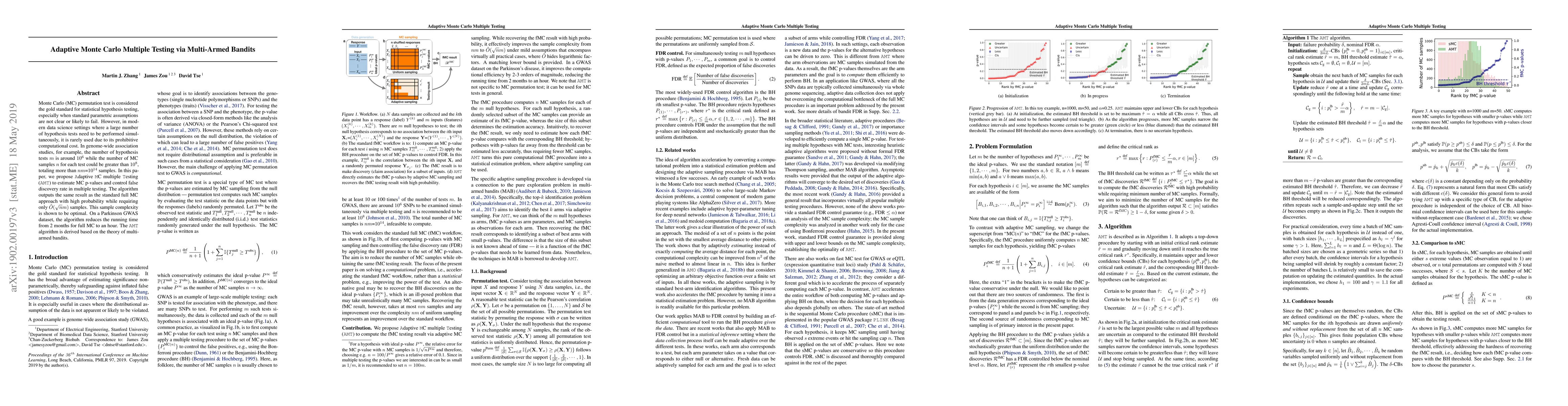 This paper proposes Adaptive Monte Carlo multiple testing (AMT) to efficiently estimate p-values and control false discovery rates in large-scale hypothesis testing, reducing computational costs from $10^{14}$ samples to $\tilde{O}(\sqrt{n}m)$ while maintaining accuracy. The AMT algorithm leverages multi-armed bandit theory to achieve optimal sample complexity.