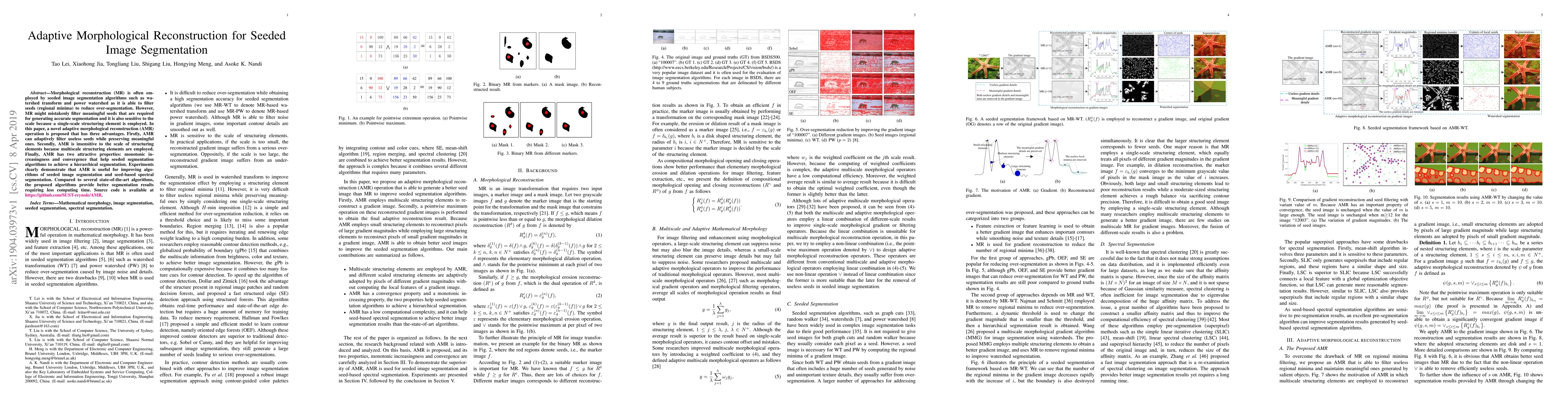 A novel adaptive morphological reconstruction (AMR) method improves seeded image segmentation by adapting to seeds while preserving meaningful ones, reducing scale sensitivity, and enhancing hierarchical segmentation.