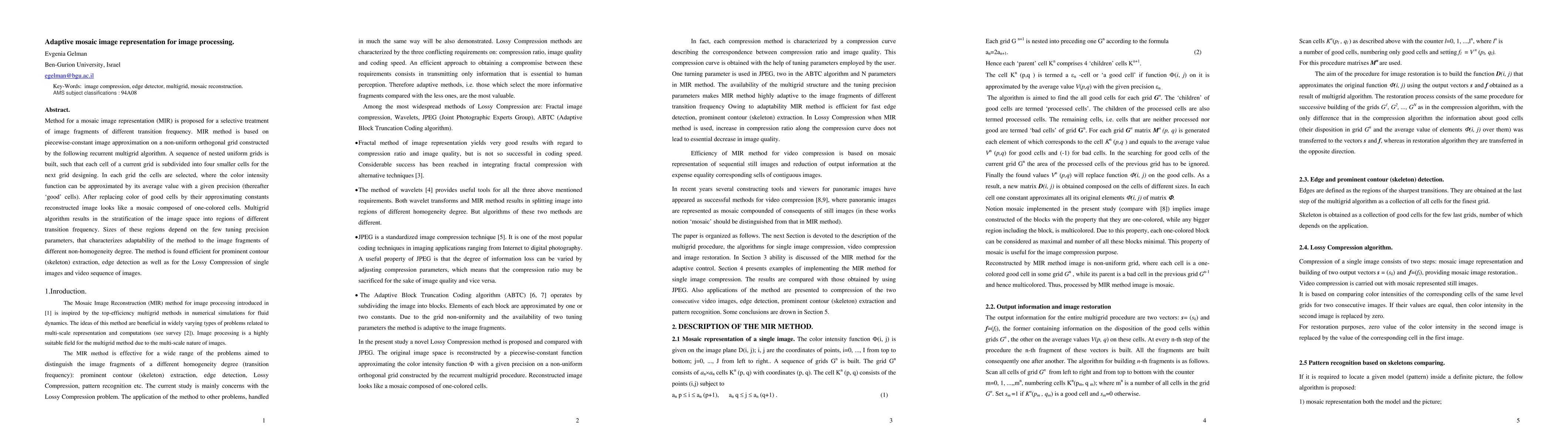 Method for a mosaic image representation (MIR) is proposed for a selective treatment of image fragments of different transition frequency. MIR method is based on piecewise-constant image approximation on a non-uniform orthogonal grid constructed by the following recurrent multigrid algorithm. A sequence of nested uniform grids is built, such that each cell of a current grid is subdivided into four smaller cells for the next grid designing. In each grid the cells are selected, where the color intensity function can be approximated by its average value with a given precision (thereafter 'good' cells). After replacing colors of good cells by their approximating constants the reconstructed image looks like a mosaic composed of one-colored cells. Multigrid algorithm results in the stratification of the image space into regions of different transition frequency. Sizes of these regions depend on the few tuning precision parameters that characterizes adaptability of the method to the image fragments of different non-homogeneity degree. The method is found efficient for prominent contour (skeleton) extraction, edge detection as well as for the Lossy Compression of single images and video sequence of images.