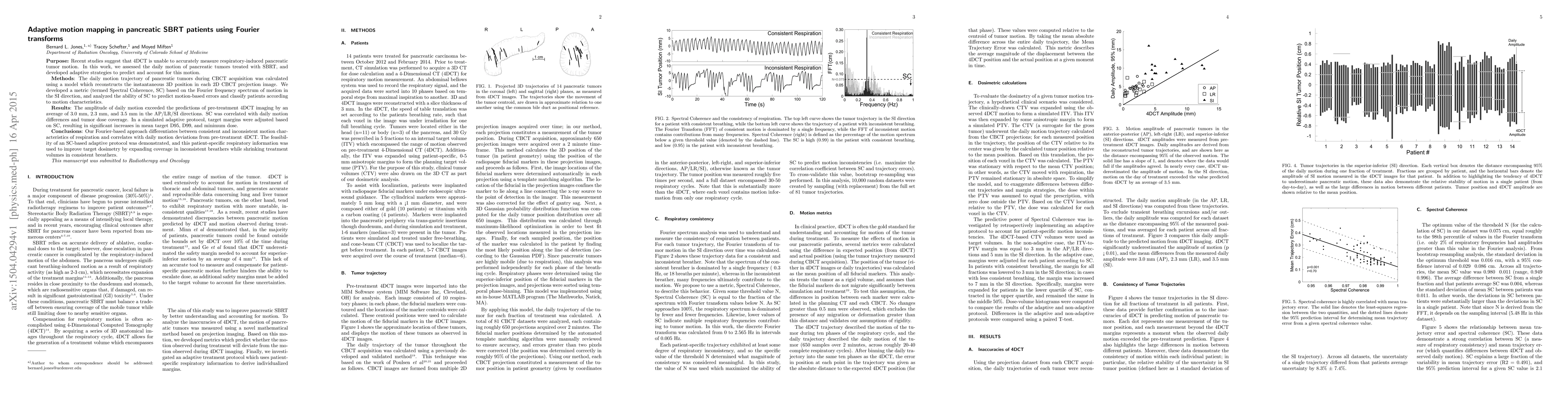 This study developed an adaptive motion mapping strategy using Fourier transforms to better predict and account for daily pancreatic tumor motion in SBRT patients, showing that the amplitude of daily motion often exceeds pre-treatment 4DCT predictions. The Spectral Coherence metric correlated with motion deviations and improved target dose coverage in an adaptive protocol.