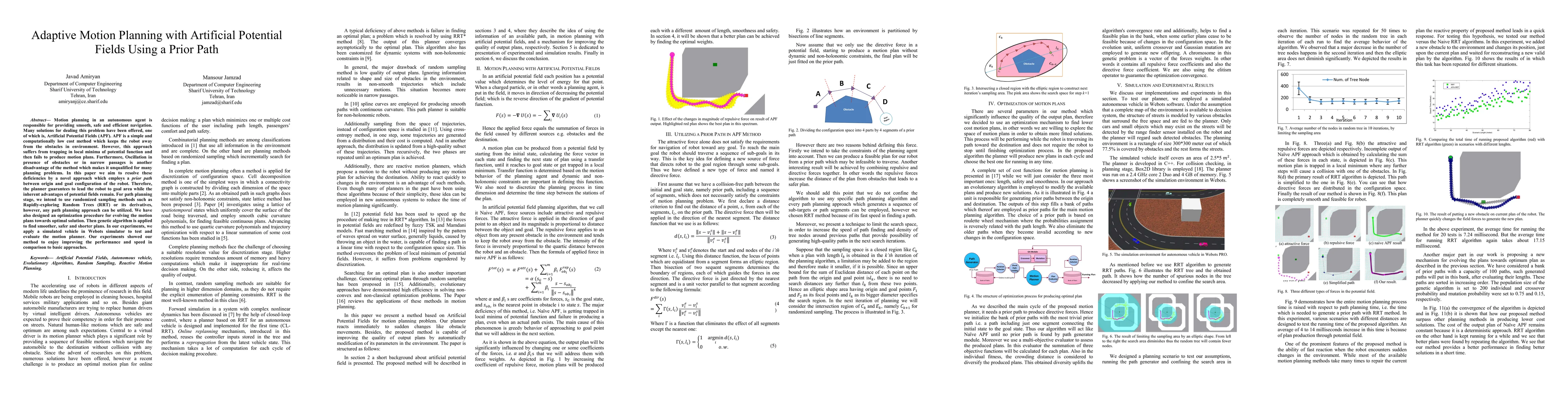 This paper proposes an adaptive motion planning method using Artificial Potential Fields enhanced by a prior path to avoid local minima traps and oscillations. The approach integrates randomized sampling and genetic algorithms for optimization, demonstrating improved performance and speed in simulations compared to basic methods.