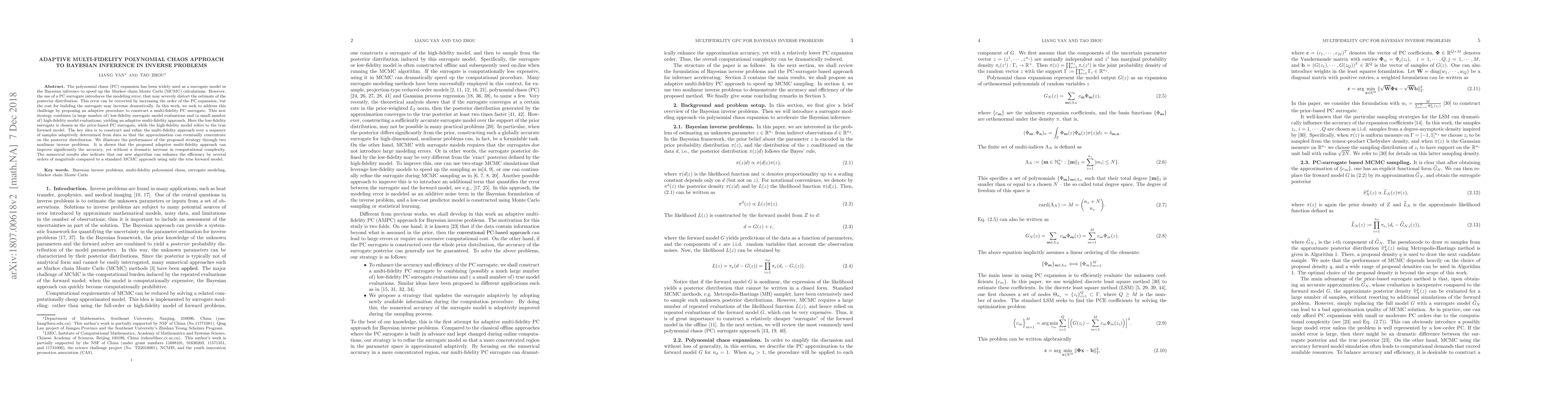 This paper proposes an adaptive multi-fidelity polynomial chaos approach to improve Bayesian inference in inverse problems, combining low-fidelity surrogate models with high-fidelity evaluations to reduce computational costs while maintaining accuracy. The adaptive strategy significantly enhances efficiency compared to standard MCMC methods.
