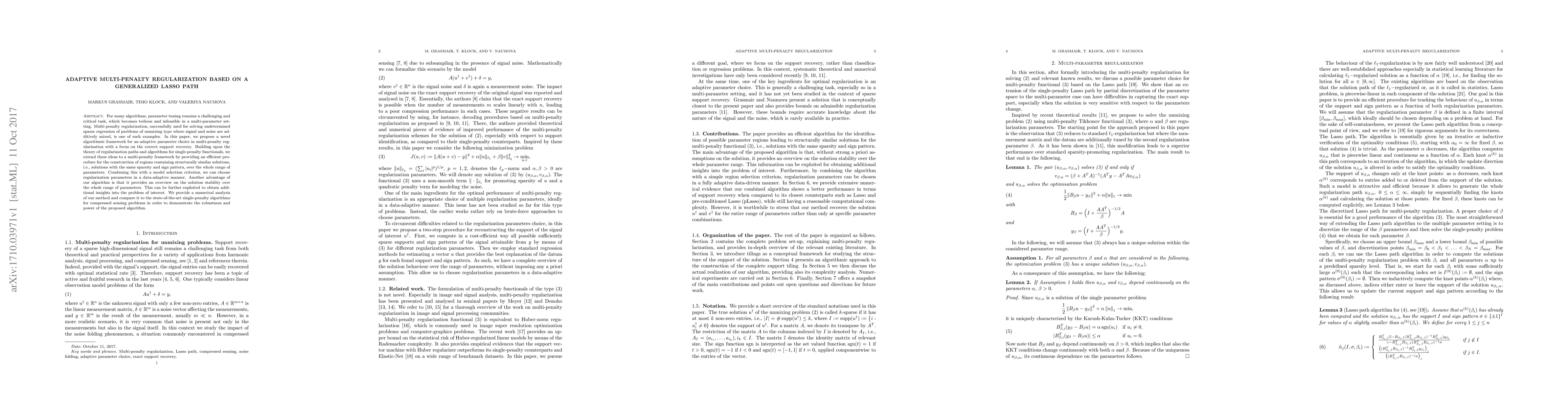 This paper introduces an adaptive multi-penalty regularization framework for parameter tuning in multi-parameter settings, focusing on accurate support recovery. It extends single-penalty regularization methods to a multi-penalty context, providing a procedure for constructing regions of structurally similar solutions and enabling data-adaptive parameter selection.