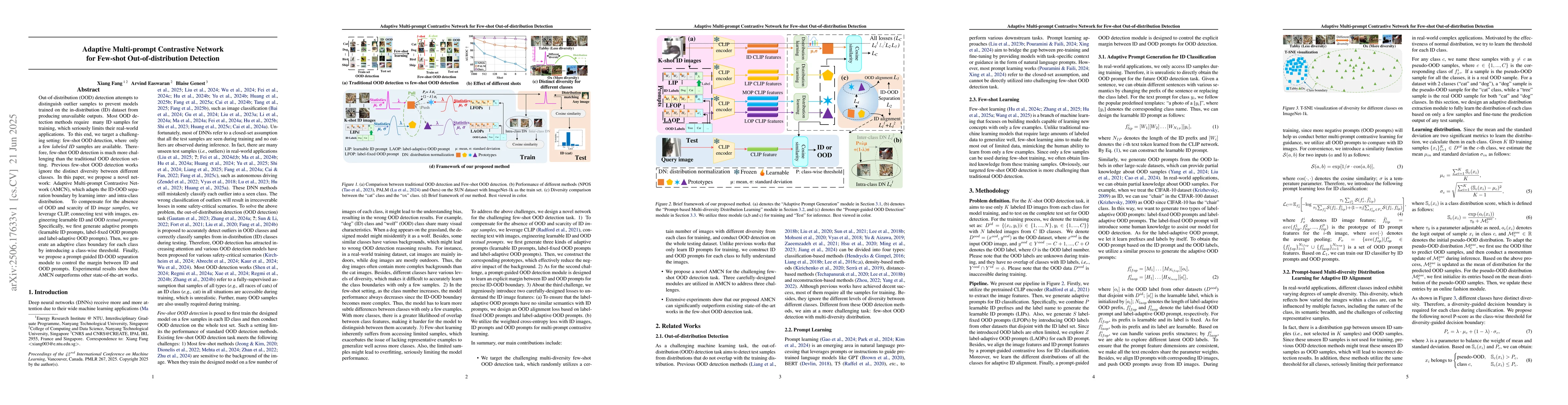 Out-of-distribution (OOD) detection attempts to distinguish outlier samples to prevent models trained on the in-distribution (ID) dataset from producing unavailable outputs. Most OOD detection methods require many IID samples for training, which seriously limits their real-world applications. To this end, we target a challenging setting: few-shot OOD detection, where {Only a few {\em labeled ID} samples are available.} Therefore, few-shot OOD detection is much more challenging than the traditional OOD detection setting. Previous few-shot OOD detection works ignore the distinct diversity between different classes. In this paper, we propose a novel network: Adaptive Multi-prompt Contrastive Network (AMCN), which adapts the ID-OOD separation boundary by learning inter- and intra-class distribution. To compensate for the absence of OOD and scarcity of ID {\em image samples}, we leverage CLIP, connecting text with images, engineering learnable ID and OOD {\em textual prompts}. Specifically, we first generate adaptive prompts (learnable ID prompts, label-fixed OOD prompts and label-adaptive OOD prompts). Then, we generate an adaptive class boundary for each class by introducing a class-wise threshold. Finally, we propose a prompt-guided ID-OOD separation module to control the margin between ID and OOD prompts. Experimental results show that AMCN outperforms other state-of-the-art works.