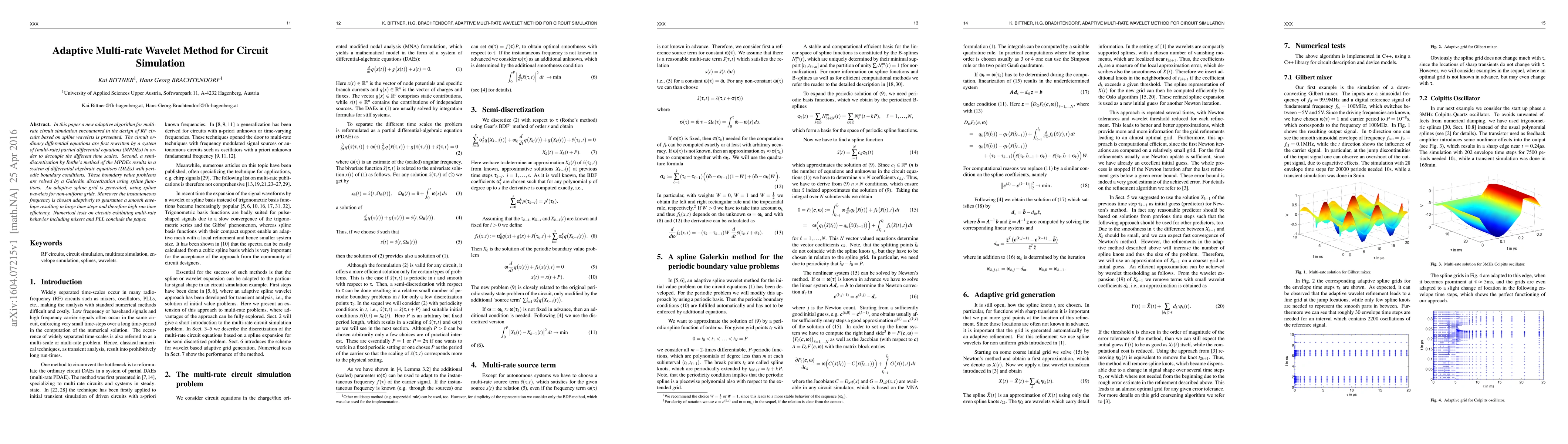 This paper introduces an adaptive multi-rate wavelet method for RF circuit simulation, transforming circuit ODEs into multi-rate PDEs to decouple time scales. It employs a Galerkin discretization with spline functions and adaptive spline grids using spline wavelets for efficiency, validated through tests on circuits like mixers and PLLs.