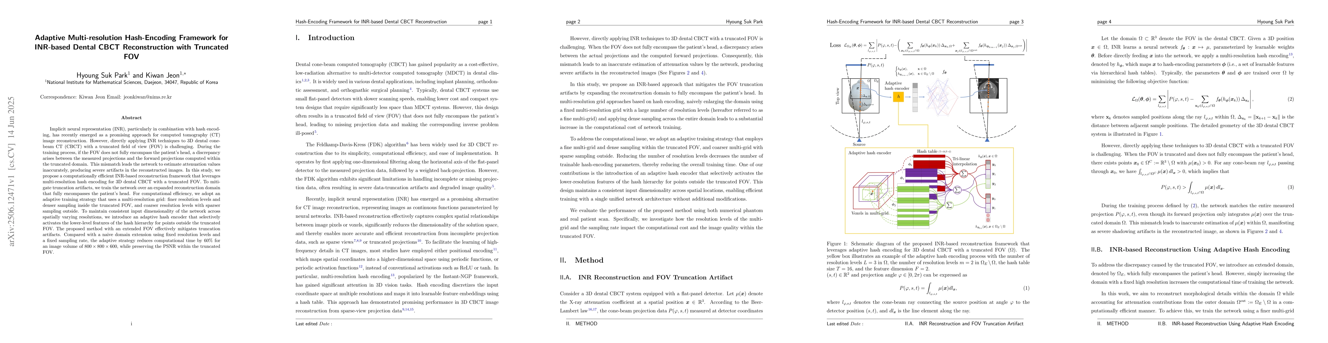 Implicit neural representation (INR), particularly in combination with hash encoding, has recently emerged as a promising approach for computed tomography (CT) image reconstruction. However, directly applying INR techniques to 3D dental cone-beam CT (CBCT) with a truncated field of view (FOV) is challenging. During the training process, if the FOV does not fully encompass the patient's head, a discrepancy arises between the measured projections and the forward projections computed within the truncated domain. This mismatch leads the network to estimate attenuation values inaccurately, producing severe artifacts in the reconstructed images. In this study, we propose a computationally efficient INR-based reconstruction framework that leverages multi-resolution hash encoding for 3D dental CBCT with a truncated FOV. To mitigate truncation artifacts, we train the network over an expanded reconstruction domain that fully encompasses the patient's head. For computational efficiency, we adopt an adaptive training strategy that uses a multi-resolution grid: finer resolution levels and denser sampling inside the truncated FOV, and coarser resolution levels with sparser sampling outside. To maintain consistent input dimensionality of the network across spatially varying resolutions, we introduce an adaptive hash encoder that selectively activates the lower-level features of the hash hierarchy for points outside the truncated FOV. The proposed method with an extended FOV effectively mitigates truncation artifacts. Compared with a naive domain extension using fixed resolution levels and a fixed sampling rate, the adaptive strategy reduces computational time by over 60% for an image volume of 800x800x600, while preserving the PSNR within the truncated FOV.