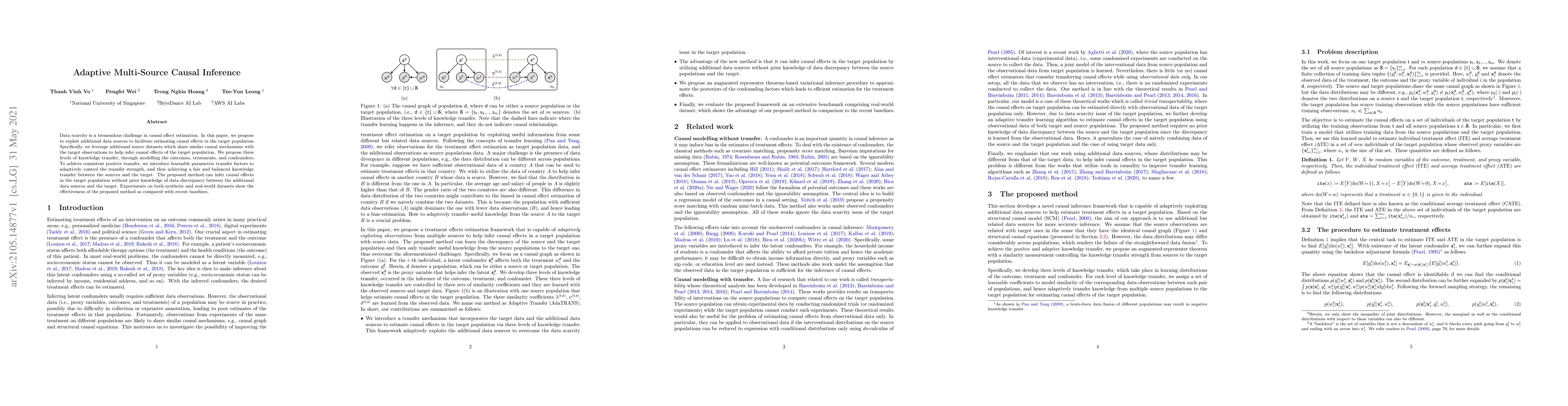 Data scarcity is a tremendous challenge in causal effect estimation. In this paper, we propose to exploit additional data sources to facilitate estimating causal effects in the target population. Specifically, we leverage additional source datasets which share similar causal mechanisms with the target observations to help infer causal effects of the target population. We propose three levels of knowledge transfer, through modelling the outcomes, treatments, and confounders. To achieve consistent positive transfer, we introduce learnable parametric transfer factors to adaptively control the transfer strength, and thus achieving a fair and balanced knowledge transfer between the sources and the target. The proposed method can infer causal effects in the target population without prior knowledge of data discrepancy between the additional data sources and the target. Experiments on both synthetic and real-world datasets show the effectiveness of the proposed method as compared with recent baselines.
