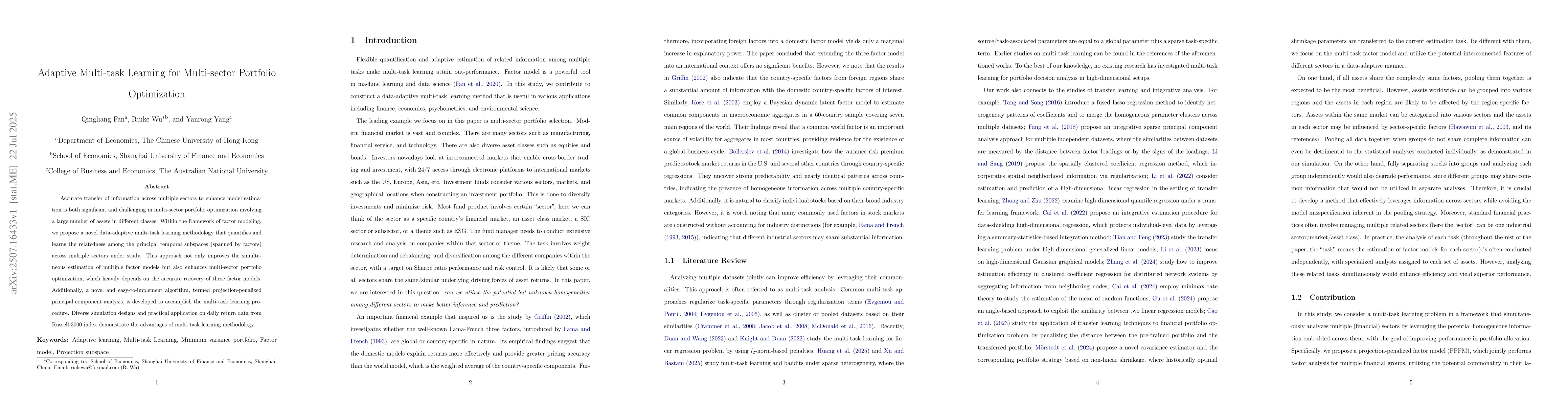 The paper proposes a data-adaptive method for multi-sector asset return modeling using a novel multi-task learning framework within factor modeling. It introduces Projection-Penalized Principal Component Analysis (PPM-PCA) for simultaneous estimation of multiple factor models across sectors, enhancing multi-sector portfolio optimization.