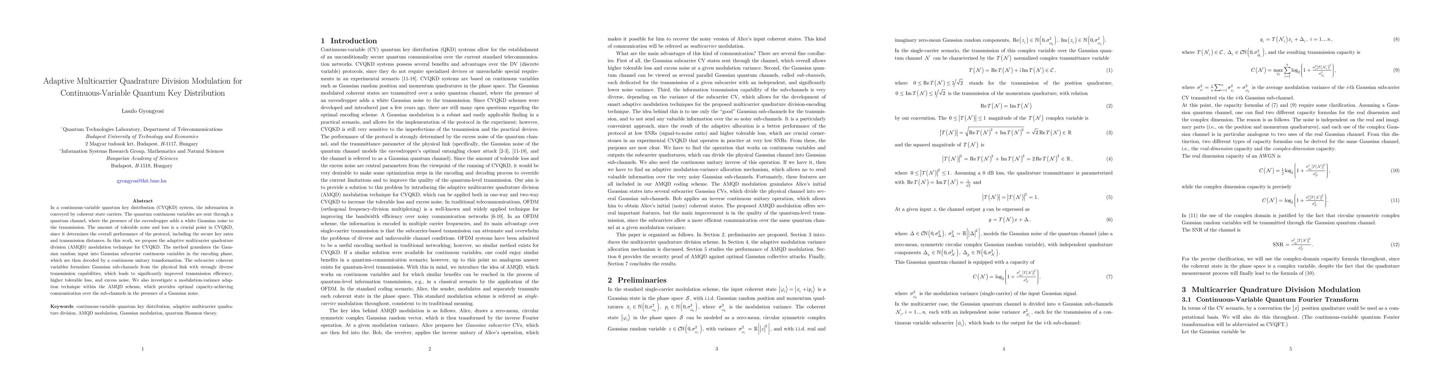 This paper proposes adaptive multicarrier quadrature division (AMQD) modulation for continuous-variable quantum key distribution (CVQKD), which enhances transmission efficiency and improves tolerance to noise and loss by encoding Gaussian random inputs into diverse subcarriers. The modulation-variance adaptation technique optimizes communication capacity under Gaussian noise.