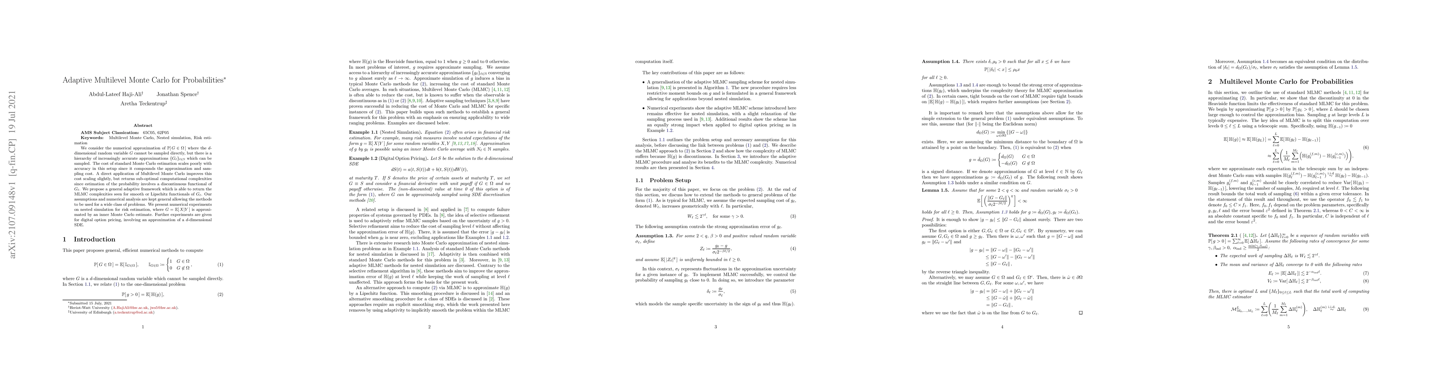 This paper introduces an adaptive Multilevel Monte Carlo (MLMC) framework to efficiently approximate probabilities when direct sampling of a random variable is impossible. The method optimizes computational cost for discontinuous functionals of approximated random variables, offering improved complexities compared to standard Monte Carlo. It's applicable to diverse problems, supported by experiments in nested simulation for risk estimation and digital option pricing.