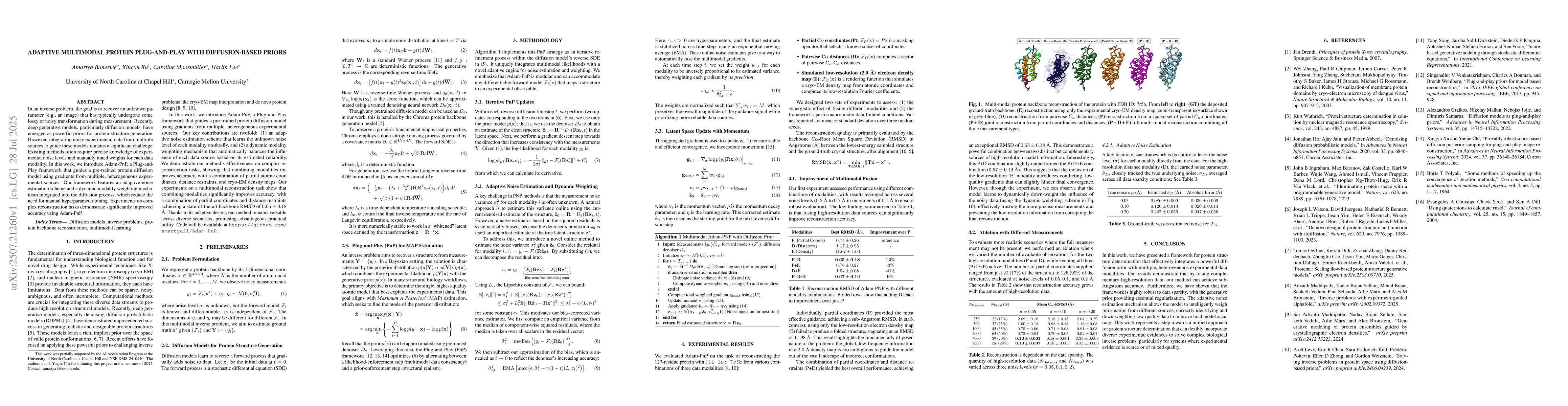 In an inverse problem, the goal is to recover an unknown parameter (e.g., an image) that has typically undergone some lossy or noisy transformation during measurement. Recently, deep generative models, particularly diffusion models, have emerged as powerful priors for protein structure generation. However, integrating noisy experimental data from multiple sources to guide these models remains a significant challenge. Existing methods often require precise knowledge of experimental noise levels and manually tuned weights for each data modality. In this work, we introduce Adam-PnP, a Plug-and-Play framework that guides a pre-trained protein diffusion model using gradients from multiple, heterogeneous experimental sources. Our framework features an adaptive noise estimation scheme and a dynamic modality weighting mechanism integrated into the diffusion process, which reduce the need for manual hyperparameter tuning. Experiments on complex reconstruction tasks demonstrate significantly improved accuracy using Adam-PnP.