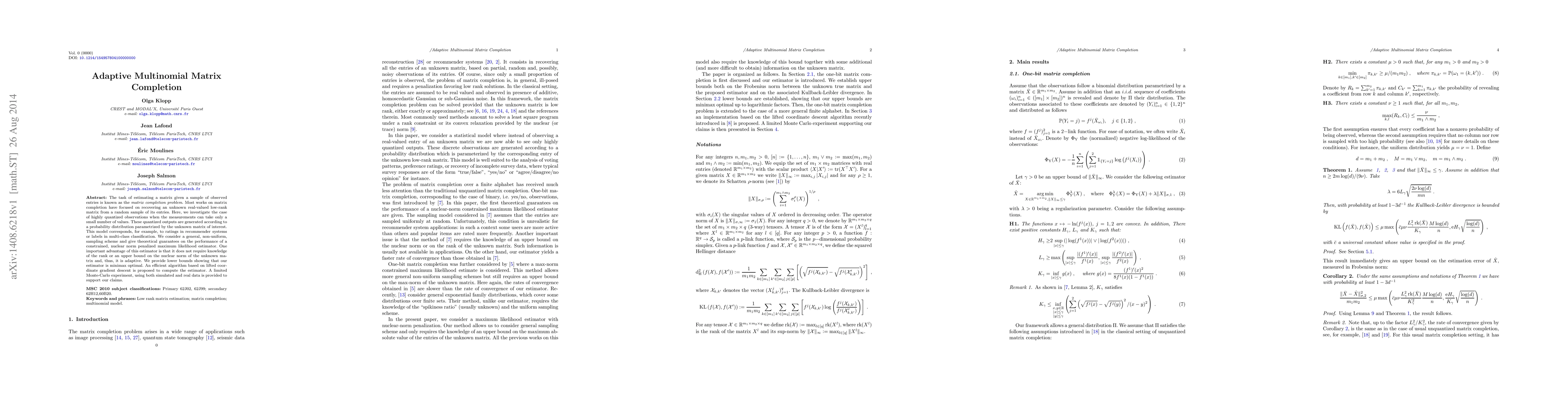 The task of estimating a matrix given a sample of observed entries is known as the \emph{matrix completion problem}. Most works on matrix completion have focused on recovering an unknown real-valued low-rank matrix from a random sample of its entries. Here, we investigate the case of highly quantized observations when the measurements can take only a small number of values. These quantized outputs are generated according to a probability distribution parametrized by the unknown matrix of interest. This model corresponds, for example, to ratings in recommender systems or labels in multi-class classification. We consider a general, non-uniform, sampling scheme and give theoretical guarantees on the performance of a constrained, nuclear norm penalized maximum likelihood estimator. One important advantage of this estimator is that it does not require knowledge of the rank or an upper bound on the nuclear norm of the unknown matrix and, thus, it is adaptive. We provide lower bounds showing that our estimator is minimax optimal. An efficient algorithm based on lifted coordinate gradient descent is proposed to compute the estimator. A limited Monte-Carlo experiment, using both simulated and real data is provided to support our claims.