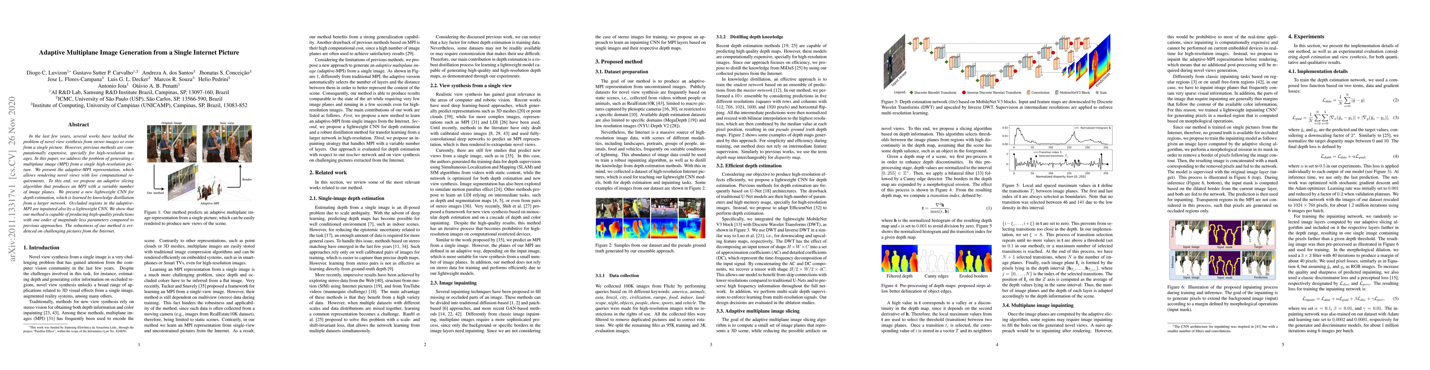This paper proposes an adaptive multiplane image (MPI) generation method from a single high-resolution picture, using an efficient slicing algorithm and a lightweight CNN for depth estimation and inpainting, achieving high-quality results with significantly fewer parameters compared to previous methods.