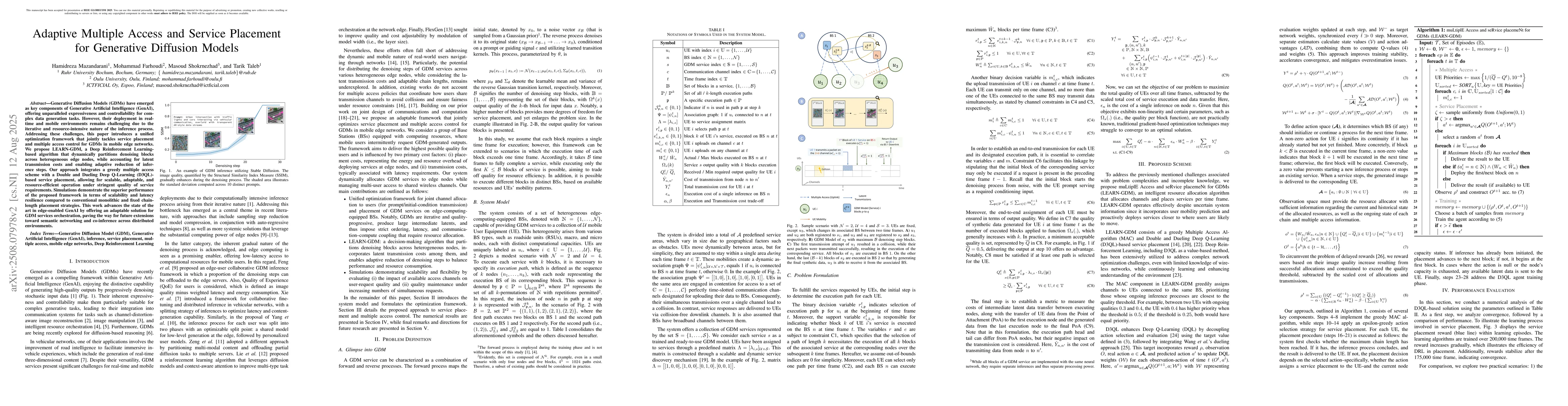 Generative Diffusion Models (GDMs) have emerged as key components of Generative Artificial Intelligence (GenAI), offering unparalleled expressiveness and controllability for complex data generation tasks. However, their deployment in real-time and mobile environments remains challenging due to the iterative and resource-intensive nature of the inference process. Addressing these challenges, this paper introduces a unified optimization framework that jointly tackles service placement and multiple access control for GDMs in mobile edge networks. We propose LEARN-GDM, a Deep Reinforcement Learning-based algorithm that dynamically partitions denoising blocks across heterogeneous edge nodes, while accounting for latent transmission costs and enabling adaptive reduction of inference steps. Our approach integrates a greedy multiple access scheme with a Double and Dueling Deep Q-Learning (D3QL)-based service placement, allowing for scalable, adaptable, and resource-efficient operation under stringent quality of service requirements. Simulations demonstrate the superior performance of the proposed framework in terms of scalability and latency resilience compared to conventional monolithic and fixed chain-length placement strategies. This work advances the state of the art in edge-enabled GenAI by offering an adaptable solution for GDM services orchestration, paving the way for future extensions toward semantic networking and co-inference across distributed environments.
