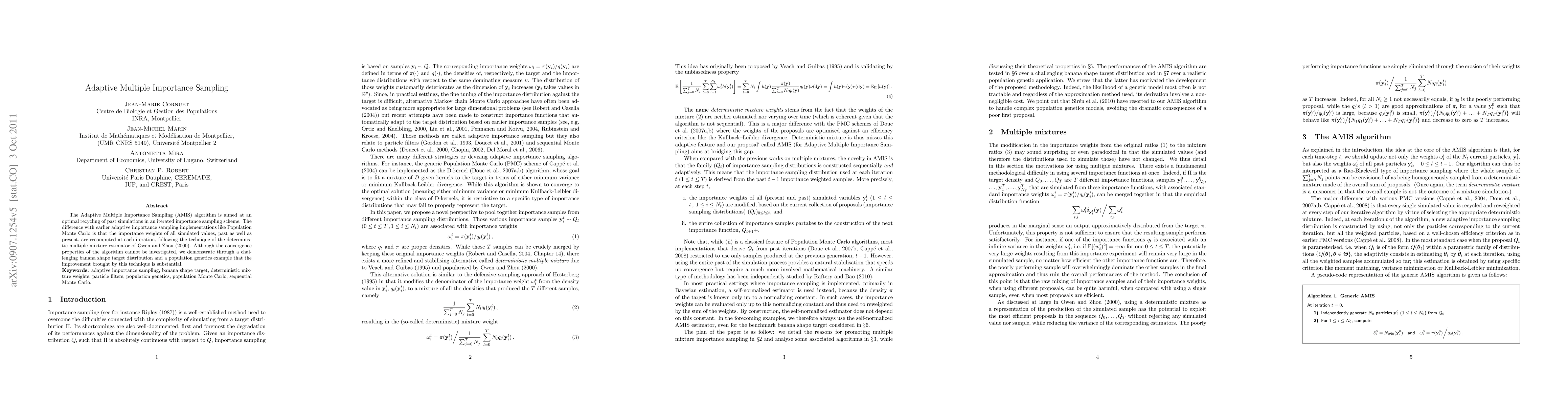 The Adaptive Multiple Importance Sampling (AMIS) algorithm optimally recycles past simulations in importance sampling, recomputing weights for all values at each iteration. Demonstrated through complex distributions, AMIS shows significant improvement over earlier adaptive methods.