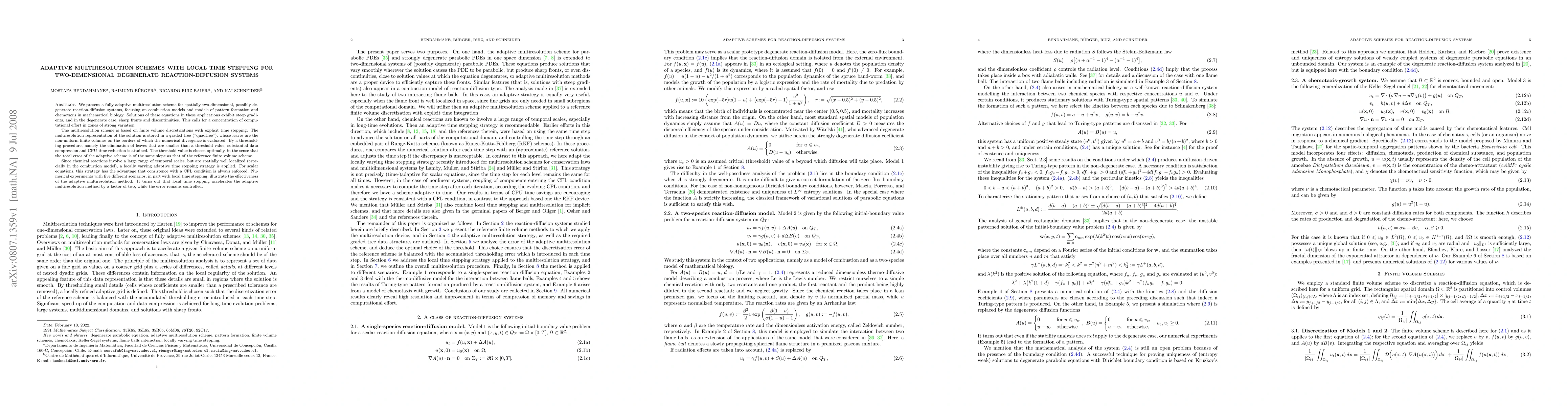 We present a fully adaptive multiresolution scheme for spatially two-dimensional, possibly degenerate reaction-diffusion systems, focusing on combustion models and models of pattern formation and chemotaxis in mathematical biology. Solutions of these equations in these applications exhibit steep gradients, and in the degenerate case, sharp fronts and discontinuities. The multiresolution scheme is based on finite volume discretizations with explicit time stepping. The multiresolution representation of the solution is stored in a graded tree. By a thresholding procedure, namely the elimination of leaves that are smaller than a threshold value, substantial data compression and CPU time reduction is attained. The threshold value is chosen optimally, in the sense that the total error of the adaptive scheme is of the same slope as that of the reference finite volume scheme. Since chemical reactions involve a large range of temporal scales, but are spatially well localized (especially in the combustion model), a locally varying adaptive time stepping strategy is applied. It turns out that local time stepping accelerates the adaptive multiresolution method by a factor of two, while the error remains controlled.
