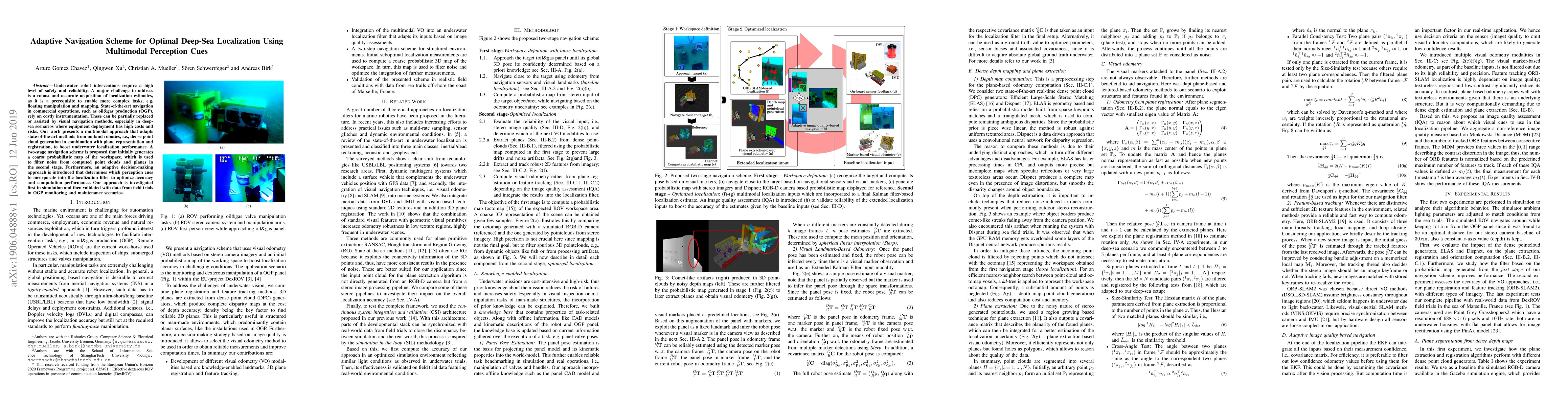 Underwater robot interventions require a high level of safety and reliability. A major challenge to address is a robust and accurate acquisition of localization estimates, as it is a prerequisite to enable more complex tasks, e.g. floating manipulation and mapping. State-of-the-art navigation in commercial operations, such as oil & gas production (OGP), rely on costly instrumentation. These can be partially replaced or assisted by visual navigation methods, especially in deep-sea scenarios where equipment deployment has high costs and risks. Our work presents a multimodal approach that adapts state-of-the-art methods from on-land robotics, i.e., dense point cloud generation in combination with plane representation and registration, to boost underwater localization performance. A two-stage navigation scheme is proposed that initially generates a coarse probabilistic map of the workspace, which is used to filter noise from computed point clouds and planes in the second stage. Furthermore, an adaptive decision-making approach is introduced that determines which perception cues to incorporate into the localization filter to optimize accuracy and computation performance. Our approach is investigated first in simulation and then validated with data from field trials in OGP monitoring and maintenance scenarios.