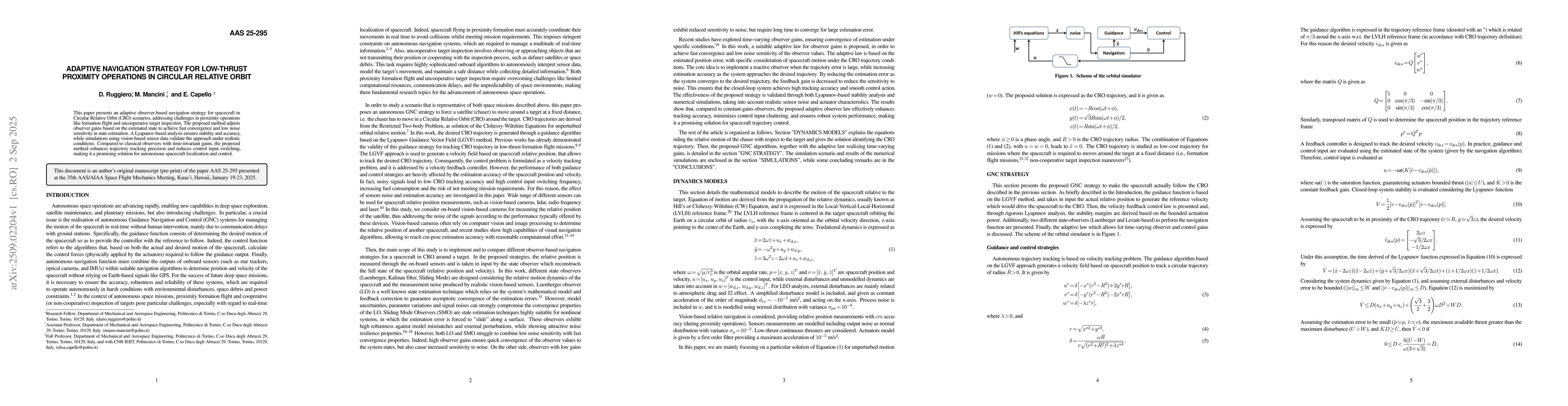 This paper presents an adaptive observer-based navigation strategy for spacecraft in Circular Relative Orbit (CRO) scenarios, addressing challenges in proximity operations like formation flight and uncooperative target inspection. The proposed method adjusts observer gains based on the estimated state to achieve fast convergence and low noise sensitivity in state estimation. A Lyapunov-based analysis ensures stability and accuracy, while simulations using vision-based sensor data validate the approach under realistic conditions. Compared to classical observers with time-invariant gains, the proposed method enhances trajectory tracking precision and reduces control input switching, making it a promising solution for autonomous spacecraft localization and control.