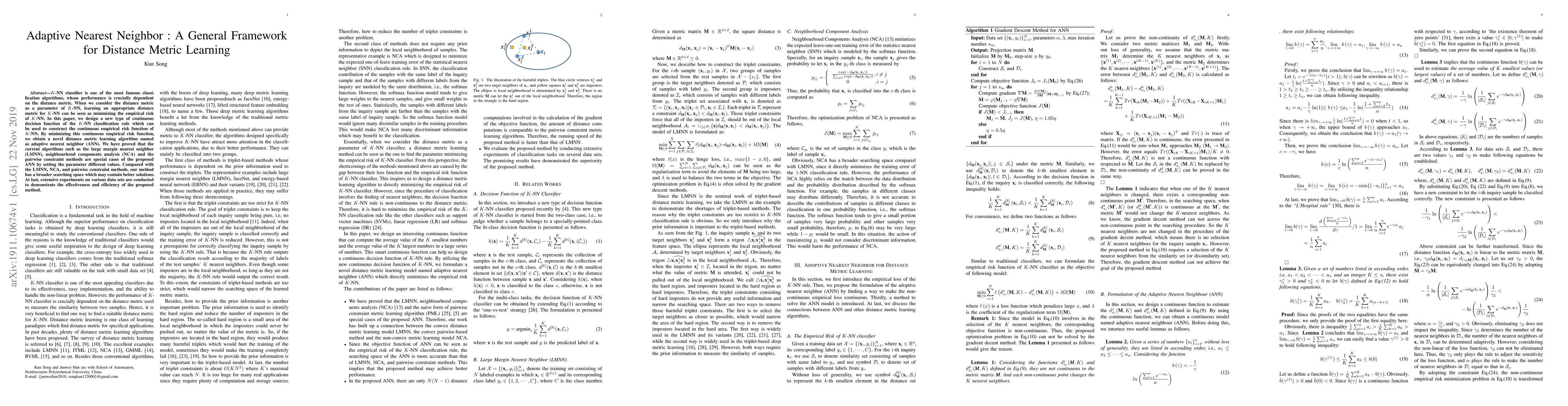This paper proposes a novel adaptive nearest neighbor (ANN) framework for learning distance metrics in $K$-NN classifiers, which generalizes existing methods like LMNN and NCA. The ANN framework optimizes a continuous empirical risk function, potentially discovering better solutions due to a broader search space, as demonstrated through experiments on various datasets.