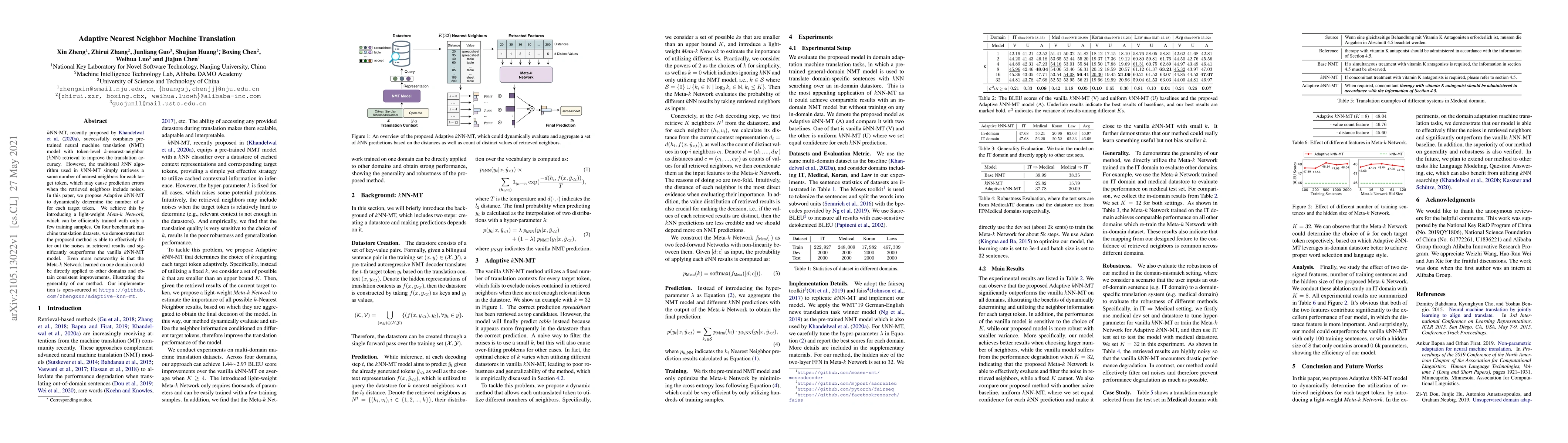 This paper proposes Adaptive kNN-MT to dynamically adjust the number of nearest neighbors for each target token in kNN-MT, using a Meta-k Network to filter out noise and improve translation accuracy. The method outperforms traditional kNN-MT and generalizes across different domains.