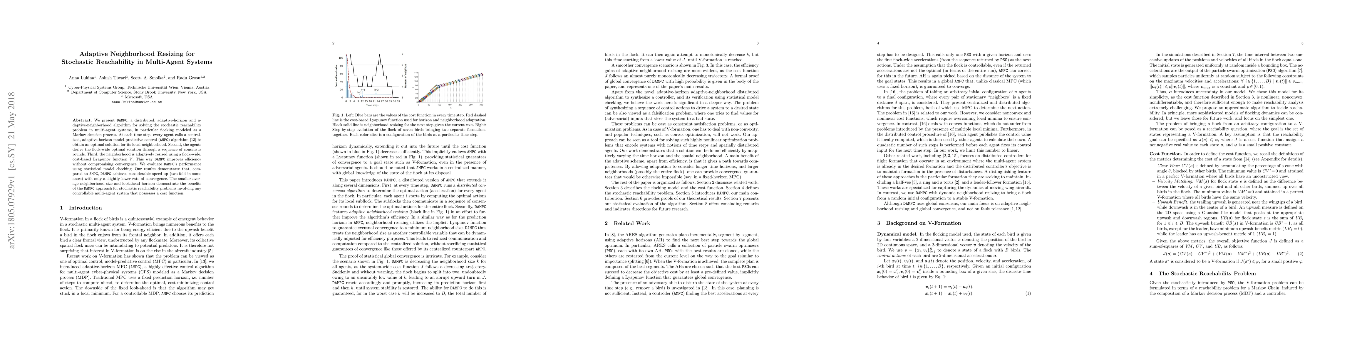 We present DAMPC, a distributed, adaptive-horizon and adaptive-neighborhood algorithm for solving the stochastic reachability problem in multi-agent systems, in particular flocking modeled as a Markov decision process. At each time step, every agent calls a centralized, adaptive-horizon model-predictive control (AMPC) algorithm to obtain an optimal solution for its local neighborhood. Second, the agents derive the flock-wide optimal solution through a sequence of consensus rounds. Third, the neighborhood is adaptively resized using a flock-wide, cost-based Lyapunov function V. This way DAMPC improves efficiency without compromising convergence. We evaluate DAMPC's performance using statistical model checking. Our results demonstrate that, compared to AMPC, DAMPC achieves considerable speed-up (two-fold in some cases) with only a slightly lower rate of convergence. The smaller average neighborhood size and lookahead horizon demonstrate the benefits of the DAMPC approach for stochastic reachability problems involving any controllable multi-agent system that possesses a cost function.