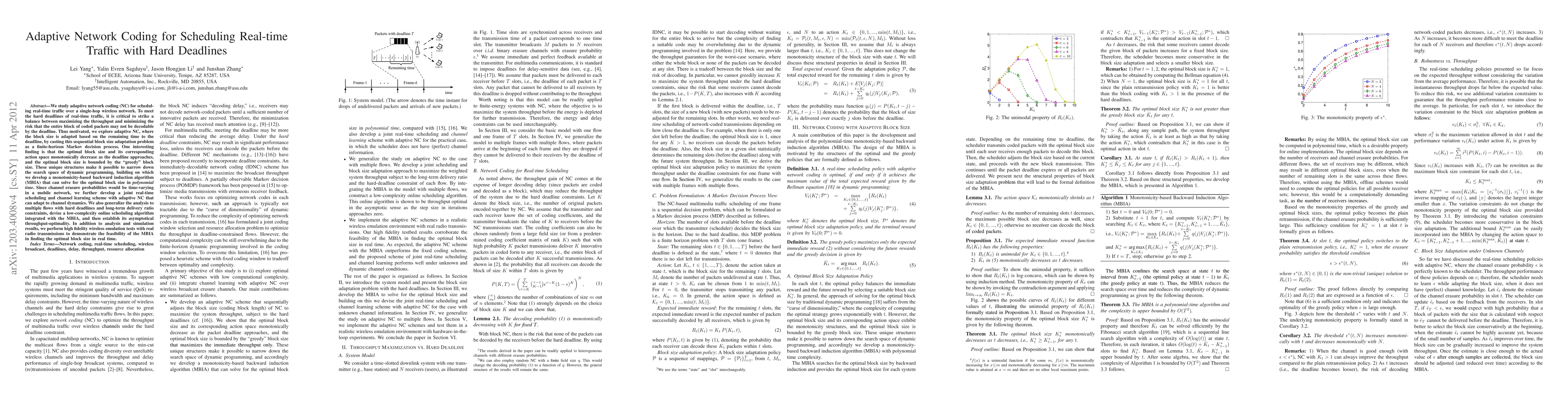 We study adaptive network coding (NC) for scheduling real-time traffic over a single-hop wireless network. To meet the hard deadlines of real-time traffic, it is critical to strike a balance between maximizing the throughput and minimizing the risk that the entire block of coded packets may not be decodable by the deadline. Thus motivated, we explore adaptive NC, where the block size is adapted based on the remaining time to the deadline, by casting this sequential block size adaptation problem as a finite-horizon Markov decision process. One interesting finding is that the optimal block size and its corresponding action space monotonically decrease as the deadline approaches, and the optimal block size is bounded by the "greedy" block size. These unique structures make it possible to narrow down the search space of dynamic programming, building on which we develop a monotonicity-based backward induction algorithm (MBIA) that can solve for the optimal block size in polynomial time. Since channel erasure probabilities would be time-varying in a mobile network, we further develop a joint real-time scheduling and channel learning scheme with adaptive NC that can adapt to channel dynamics. We also generalize the analysis to multiple flows with hard deadlines and long-term delivery ratio constraints, devise a low-complexity online scheduling algorithm integrated with the MBIA, and then establish its asymptotical throughput-optimality. In addition to analysis and simulation results, we perform high fidelity wireless emulation tests with real radio transmissions to demonstrate the feasibility of the MBIA in finding the optimal block size in real time.
