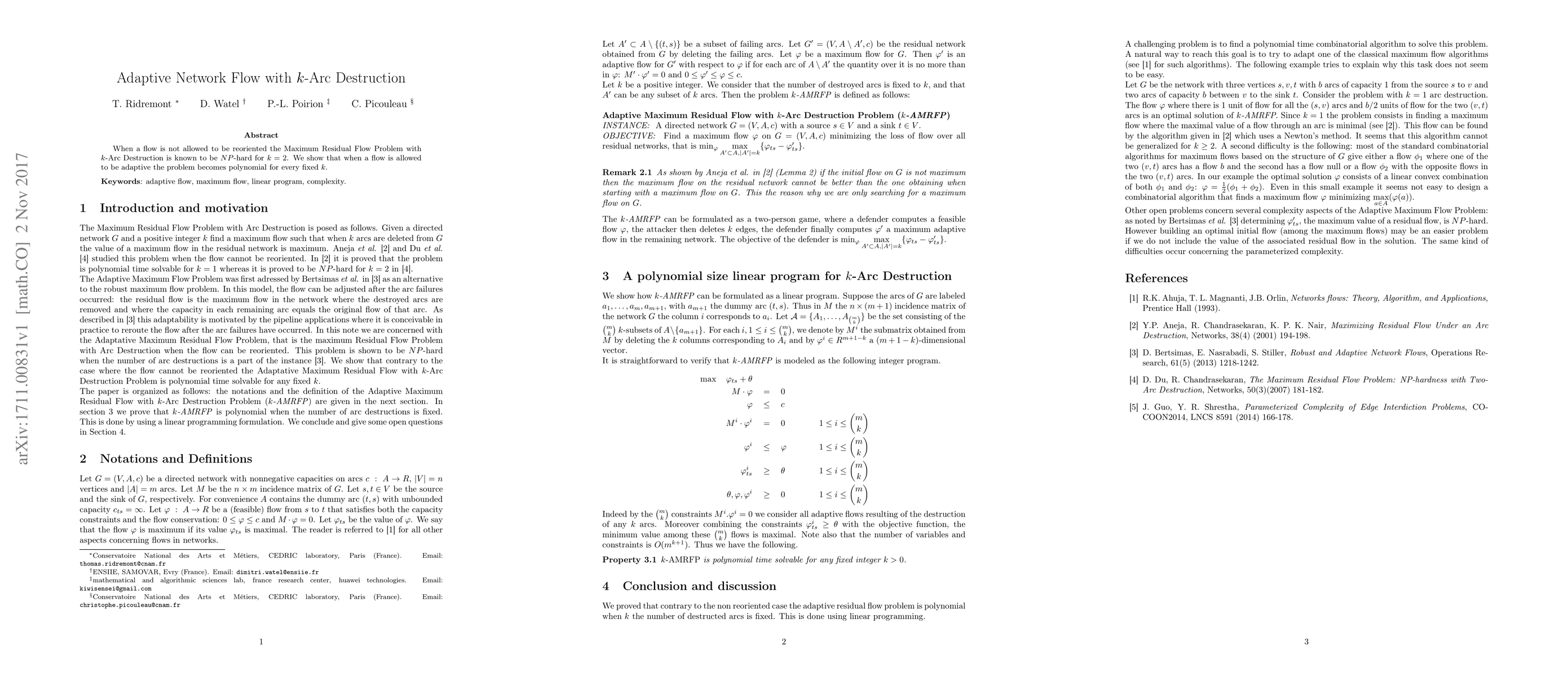This research proves that allowing adaptive flow in the Maximum Residual Flow Problem with $k$-Arc Destruction makes it polynomial for any fixed $k$, contrasting with its $NP$-hardness for $k=2$ when flow cannot be reoriented.