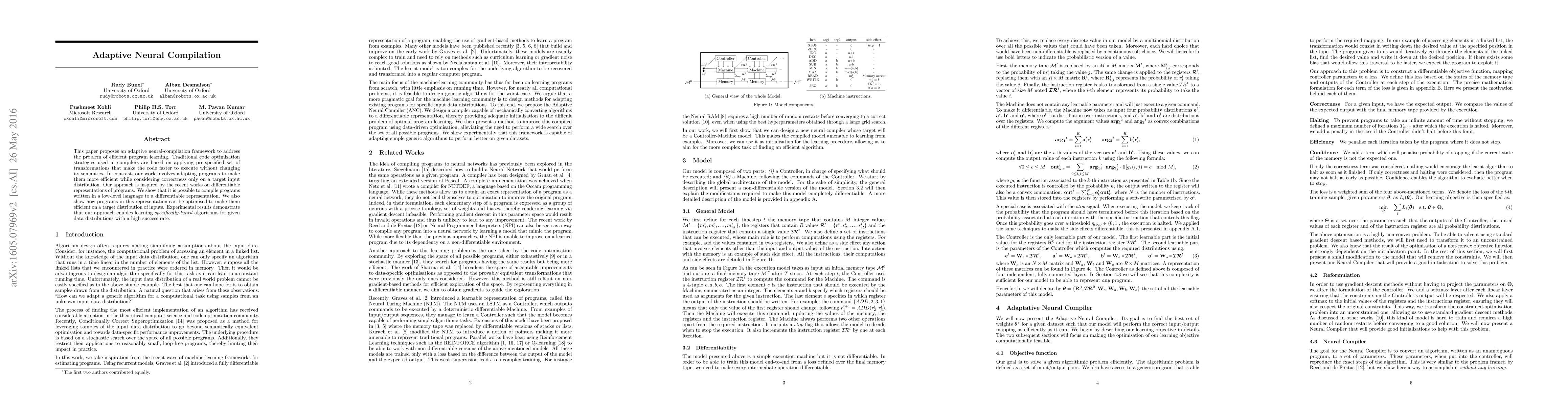 Researchers propose an adaptive neural-compilation framework to optimize programs for efficiency while maintaining correctness on specific input distributions. Experimental results show a high success rate in learning specifically-tuned algorithms for given data distributions.
