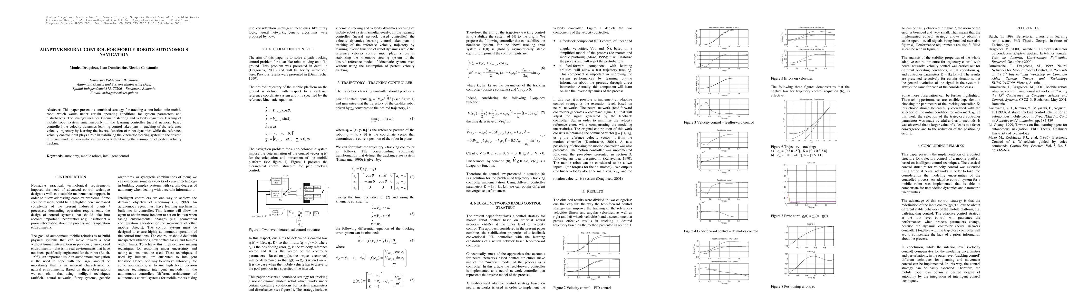 This paper proposes an adaptive neural control strategy for mobile robots that combines kinematic steering and velocity dynamics learning to enable autonomous navigation under varying conditions. The neural network-based controller learns the inverse of robot dynamics to track velocity trajectories while stabilizing kinematic steering without assuming perfect velocity tracking.