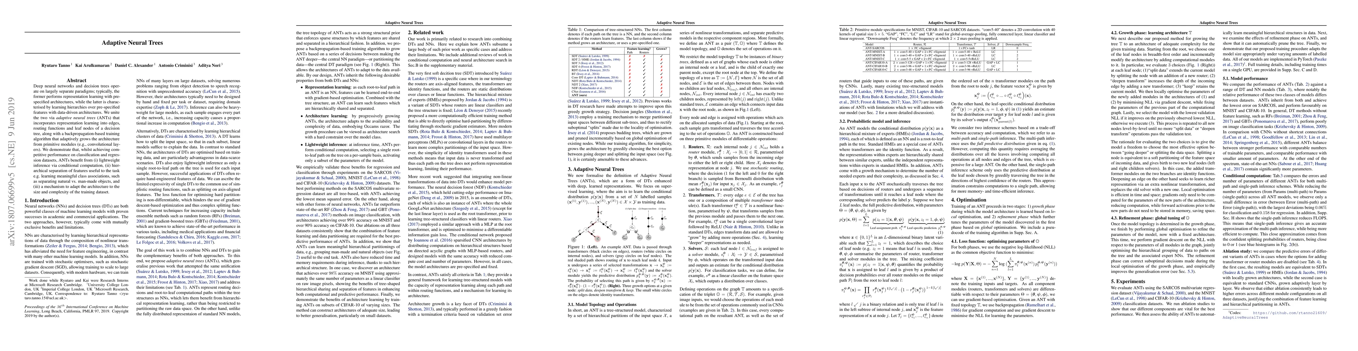 Adaptive Neural Trees (ANTs) integrate representation learning into decision trees, combining the strengths of deep neural networks and traditional decision trees. This hybrid approach achieves competitive performance while offering lightweight inference, meaningful feature separation, and adaptive architecture growth.