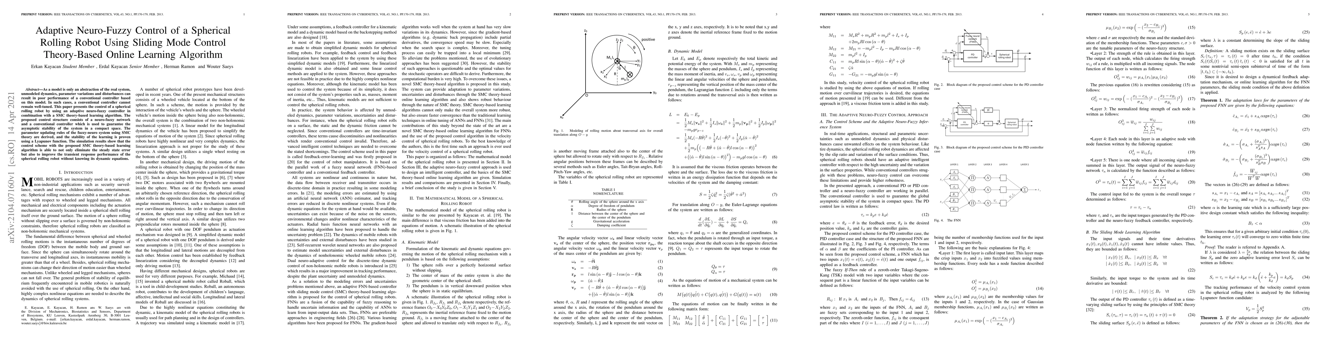 As a model is only an abstraction of the real system, unmodeled dynamics, parameter variations, and disturbances can result in poor performance of a conventional controller based on this model. In such cases, a conventional controller cannot remain well tuned. This paper presents the control of a spherical rolling robot by using an adaptive neuro-fuzzy controller in combination with a sliding-mode control (SMC)-theory-based learning algorithm. The proposed control structure consists of a neuro-fuzzy network and a conventional controller which is used to guarantee the asymptotic stability of the system in a compact space. The parameter updating rules of the neuro-fuzzy system using SMC theory are derived, and the stability of the learning is proven using a Lyapunov function. The simulation results show that the control scheme with the proposed SMC-theory-based learning algorithm is able to not only eliminate the steady-state error but also improve the transient response performance of the spherical rolling robot without knowing its dynamic equations.